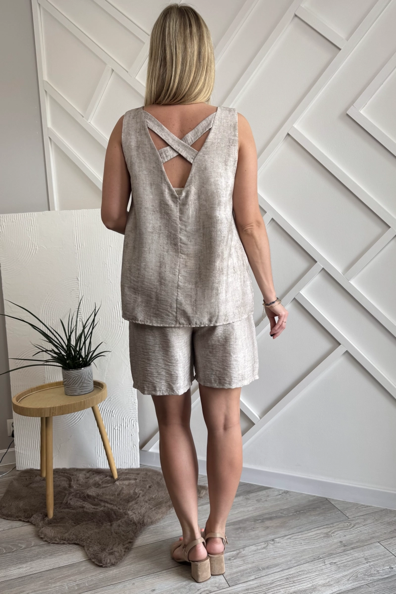 Komplet damski składający się z bluzki i spodenek w kolorze beżowym. Bluzka na grubszych ramiączkach, z okrągłym dekoltem, dodatkowo ramiączka efektownie krzyżują się na plecach. Spodenki o nieco dłuższych nogawkach, z kieszeniami po bokach, ponadto czarny pasek z ekoskóry w zestawie. Warto również zwrócić uwagę na tkaninę: materiał nie jest jednolity, ma ciekawy nieregularny wzór (zdjęcia). Skład tkaniny to w 90% wiskoza – przewiewna, lekka i niezwykle przyjemna dla skóry, dlatego świetnie sprawdza się w letnie dni.