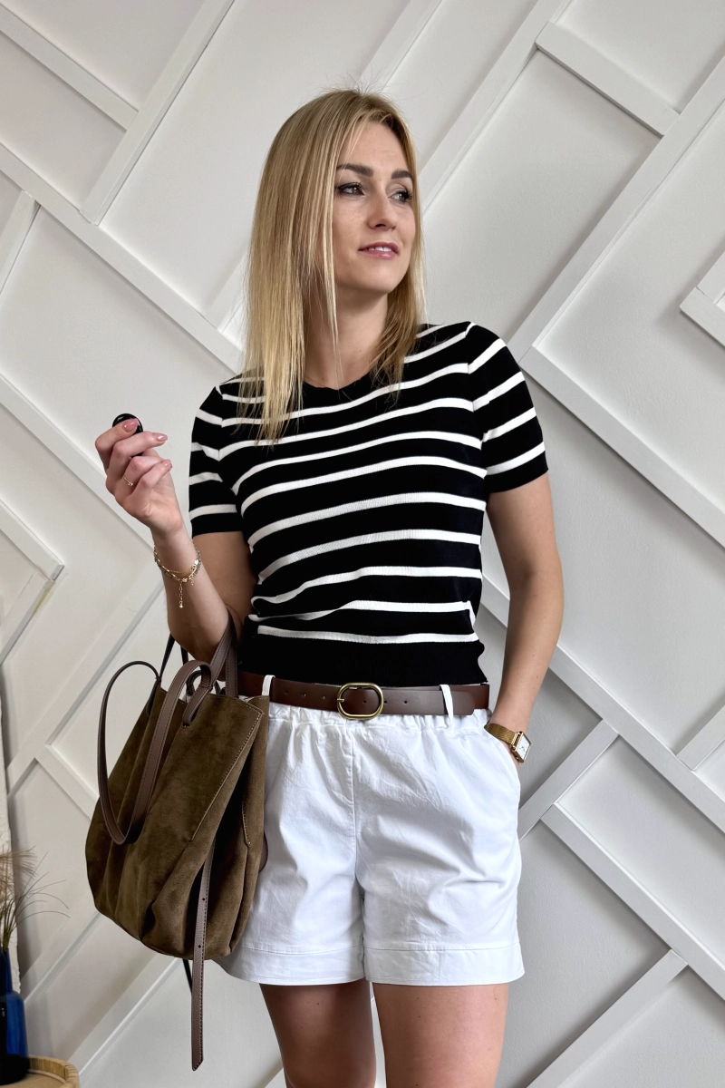 Bluzka w paski na krótki rękaw z dzianiny. Bluzka czarna w białe paski, na dole ma ściągacz. Materiał dzianinowy/sweterkowy. Producent przewidział dwa rozmiary, jednakże niewiele się od siebie różnią (na zdjęciach jest większy).