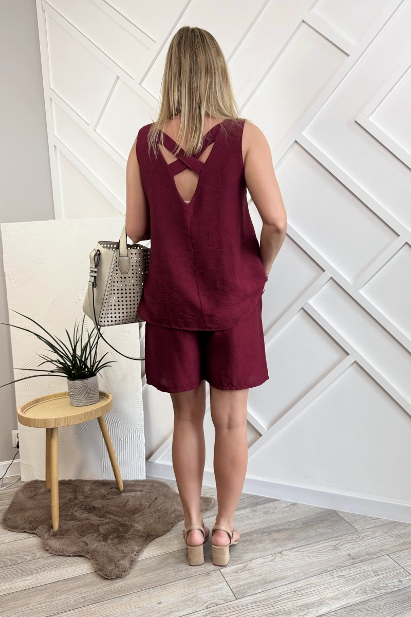 Komplet damski bordowy składający się z bluzki i spodenek. Bluzka na grubszych ramiączkach, z okrągłym dekoltem, dodatkowo ramiączka efektownie krzyżują się na plecach. Spodenki o nieco dłuższych nogawkach, z kieszeniami po bokach, ponadto czarny pasek z ekoskóry w zestawie. Warto również zwrócić uwagę na tkaninę: materiał nie jest jednolity, ma ciekawy nieregularny wzór (zdjęcia). Skład tkaniny to w 90% wiskoza – przewiewna, lekka i niezwykle przyjemna dla skóry, dlatego świetnie sprawdza się w letnie dni.