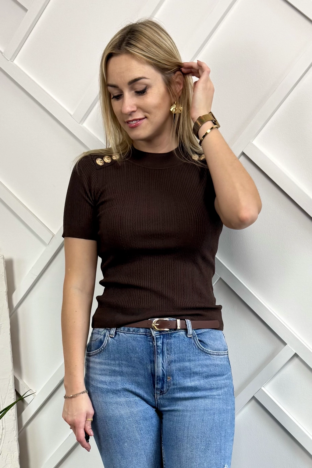 Brązowa gładka bluzka pod marynarkę to element garderoby, który nigdy nie wychodzi z mody i często po nią sięgamy. Przede wszystkim jej minimalistyczny fason sprawia, że doskonale komponuje się z marynarkami, natomiast miękki materiał zapewnia komfort noszenia przez cały dzień. Dzianinowa bluzka to klasyczny basic z krótkim rękawem i dekoltem typu półgolf. Ponadto bluzka ma na ramionach ozdobne złote guziki. Świetna baza do stylizacji, czy pod marynarkę, czy pod sweter. Przyjemny w noszeniu materiał – lekki prążek, mocno elastyczna. Rozmiar uniwersalny.