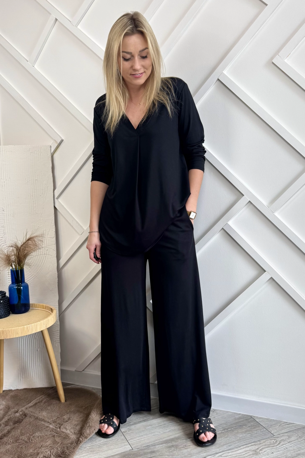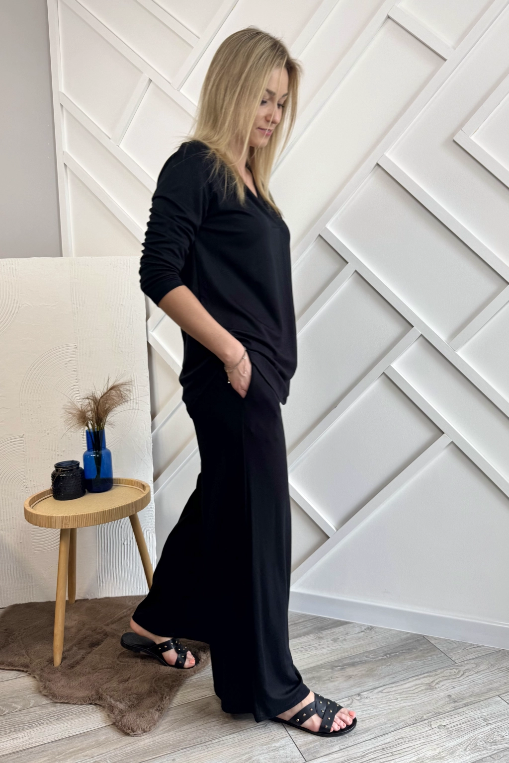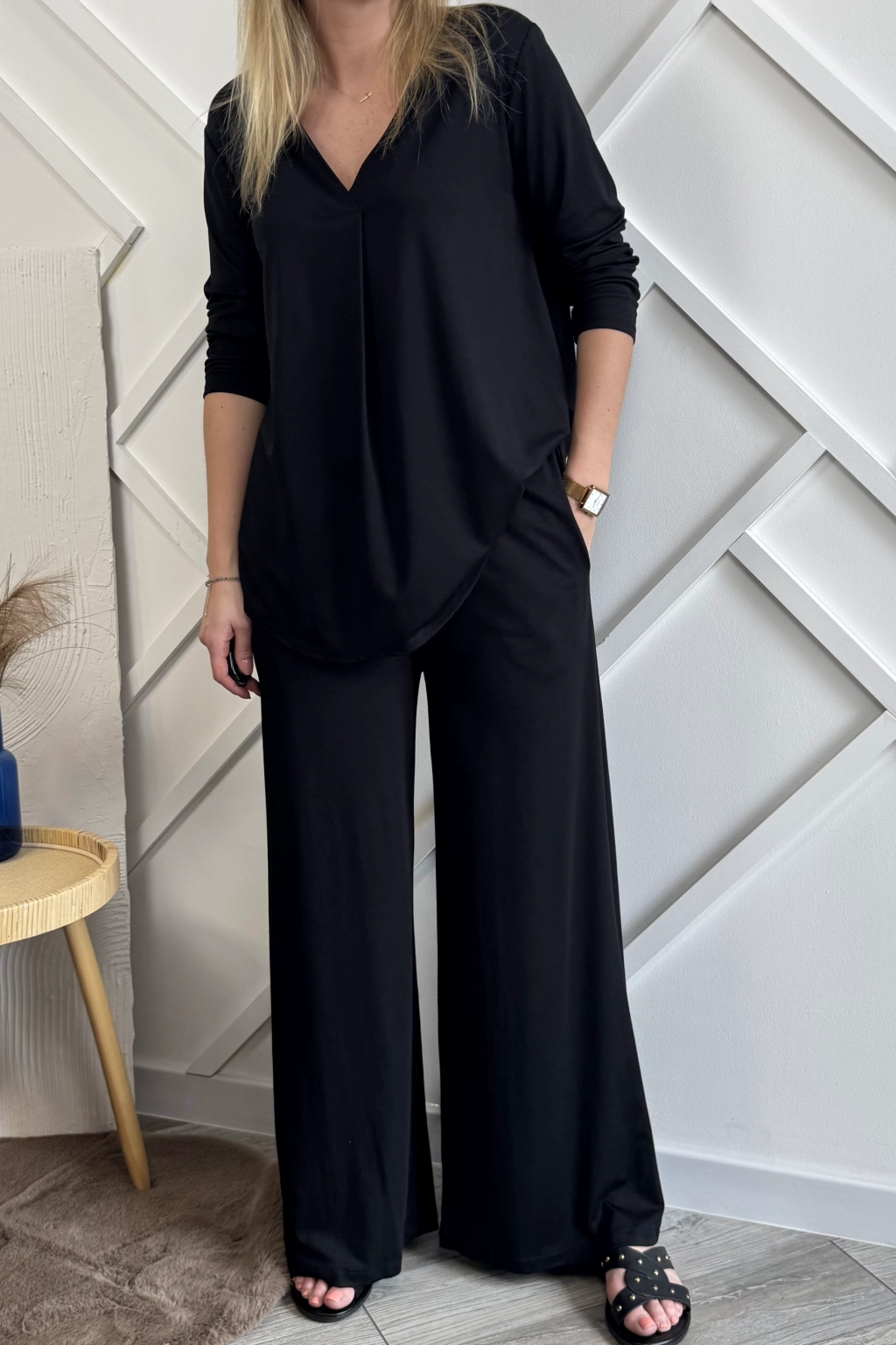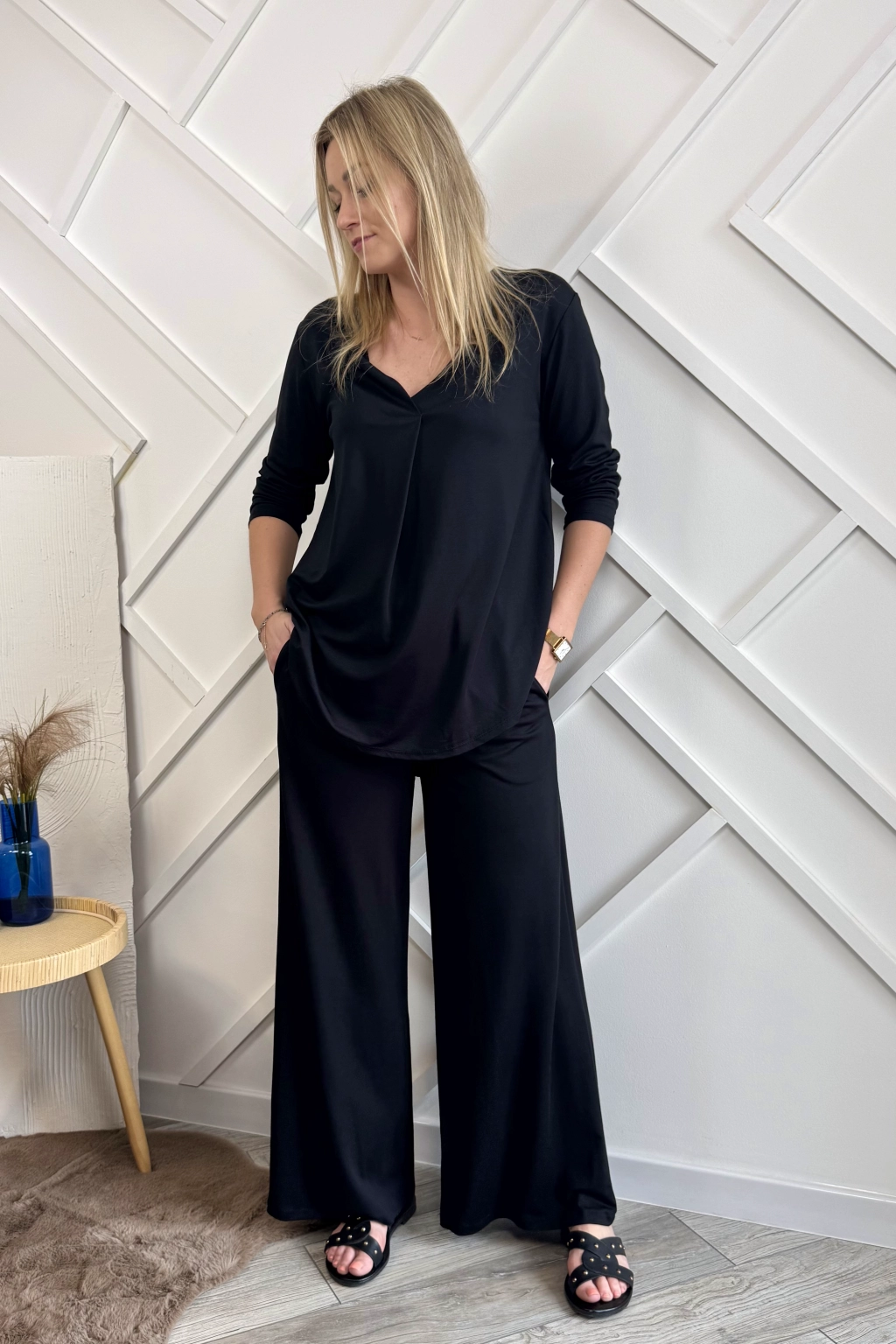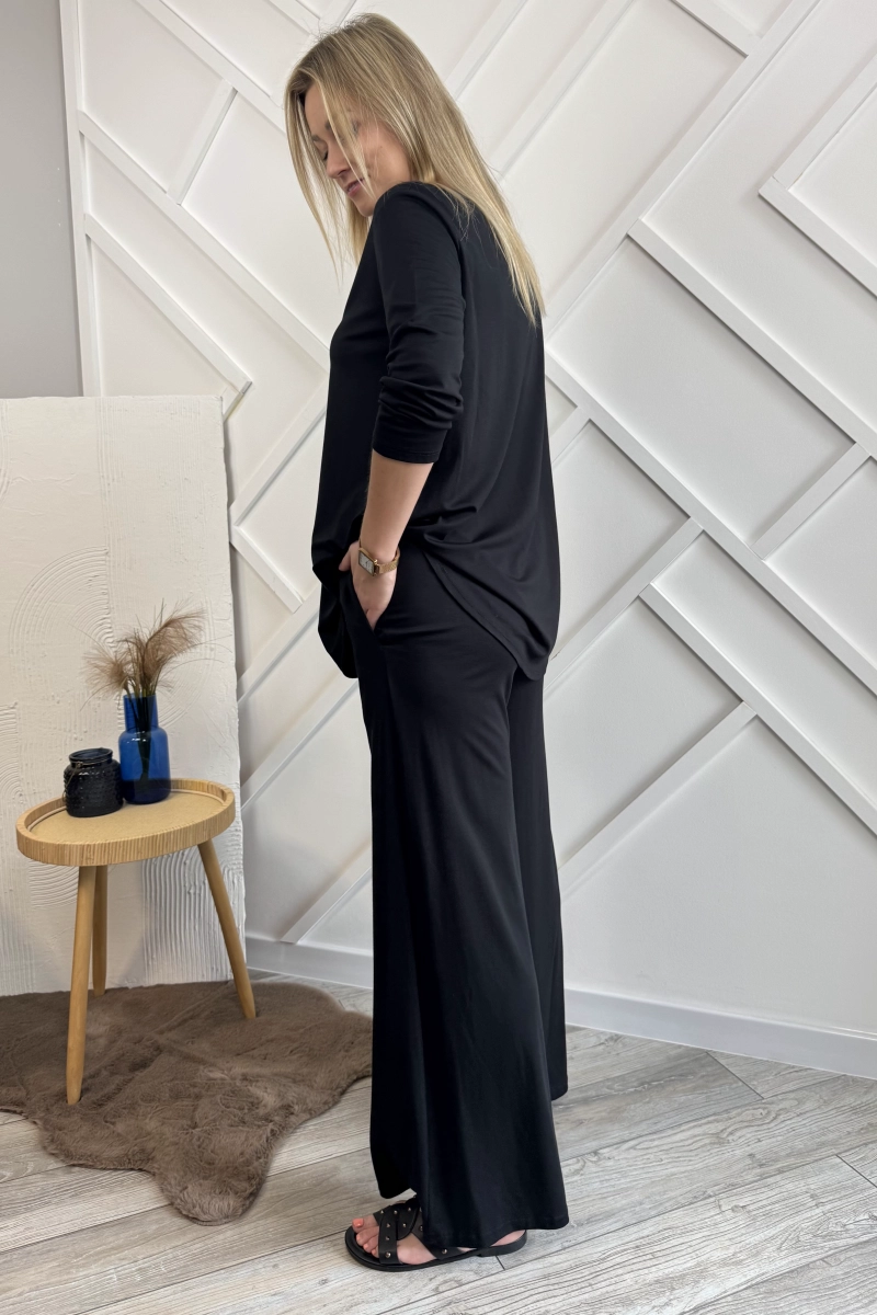 Czarny komplet damski składający z szerokich spodni oraz bluzki. Spodnie mają w pasie gumę oraz dwie kieszenie po bokach. Bluzka natomiast ma rękawy długości 3/4 oraz dekolt w serek.