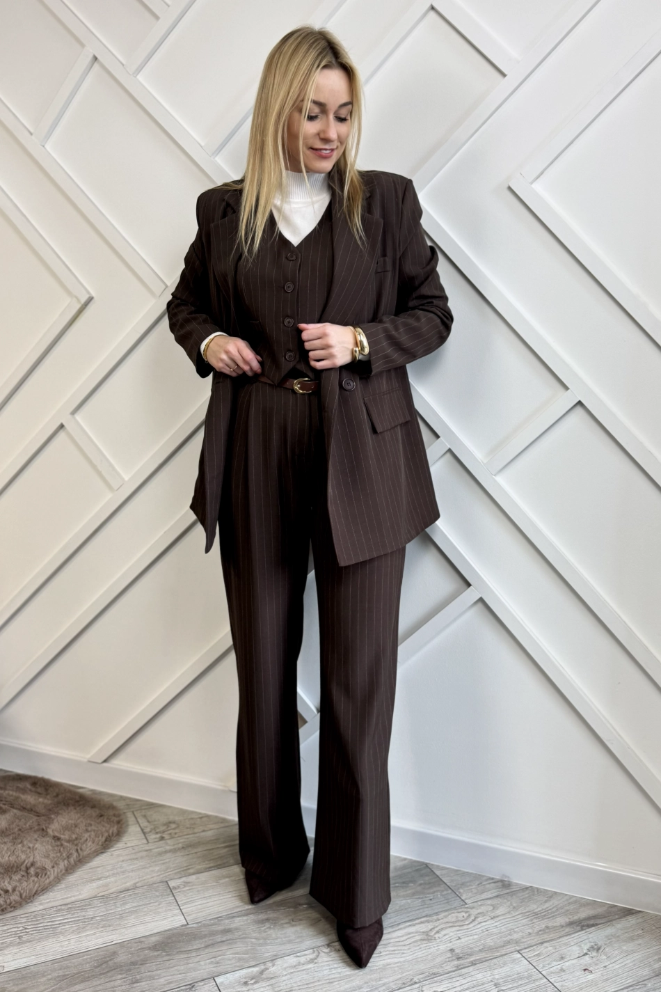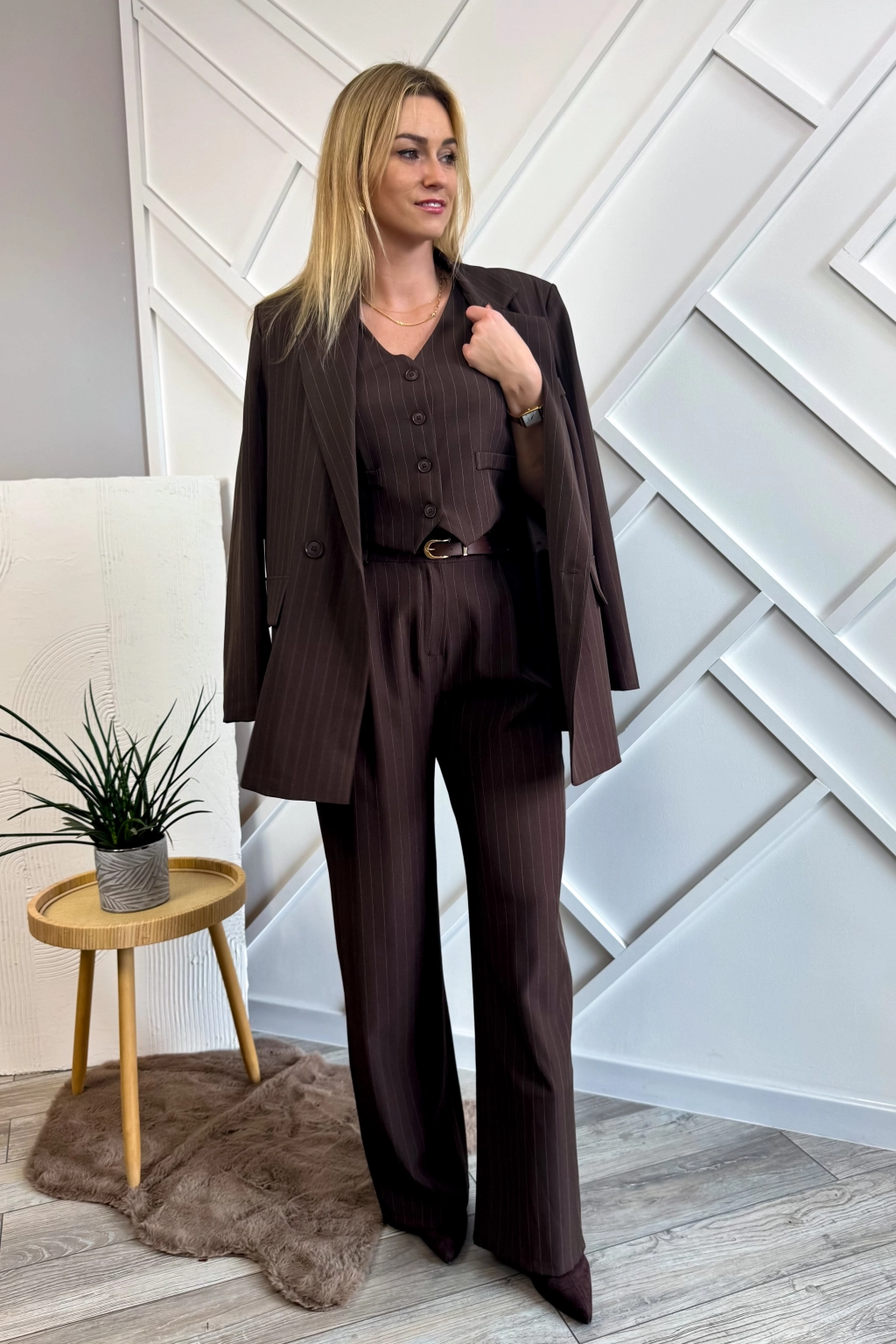 Brązowy garnitur damski  trzyczęściowy, na który składa się: