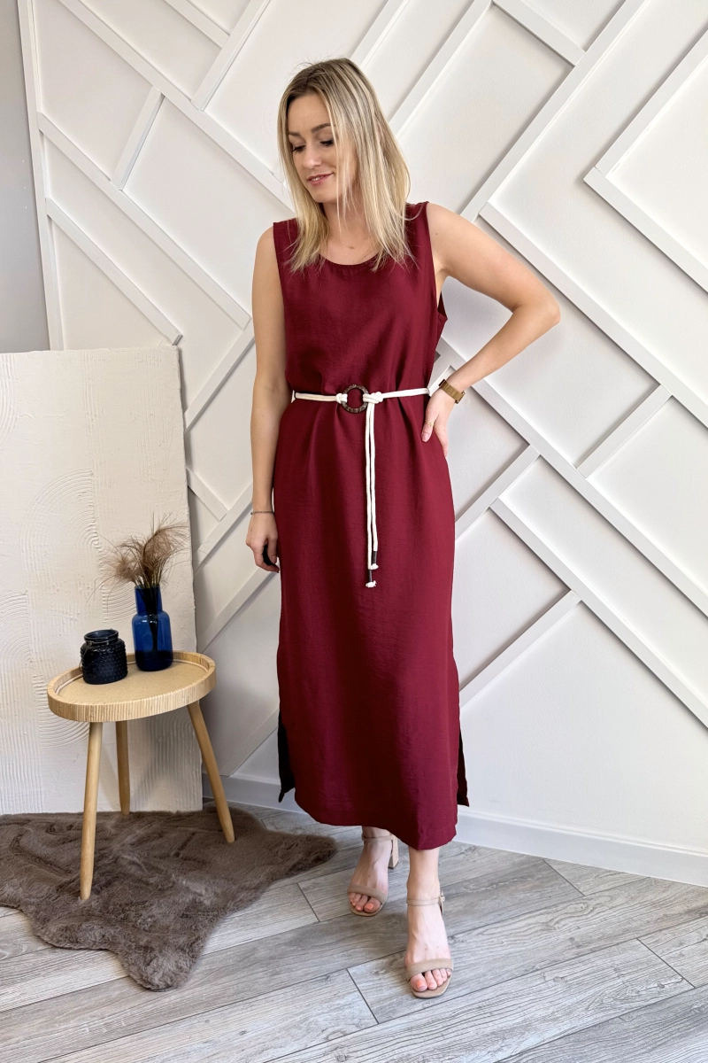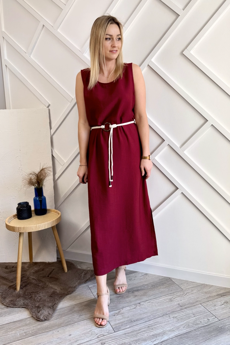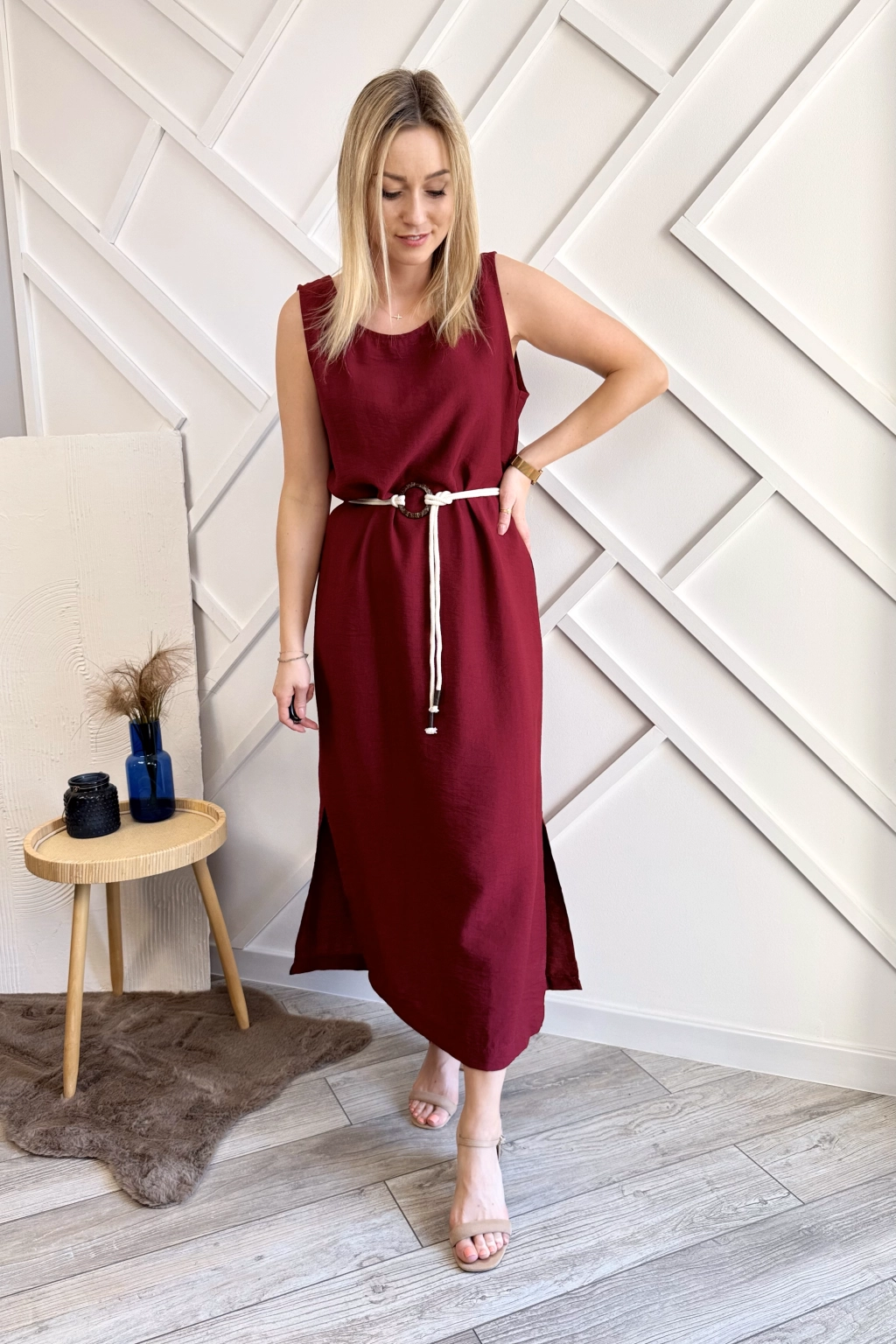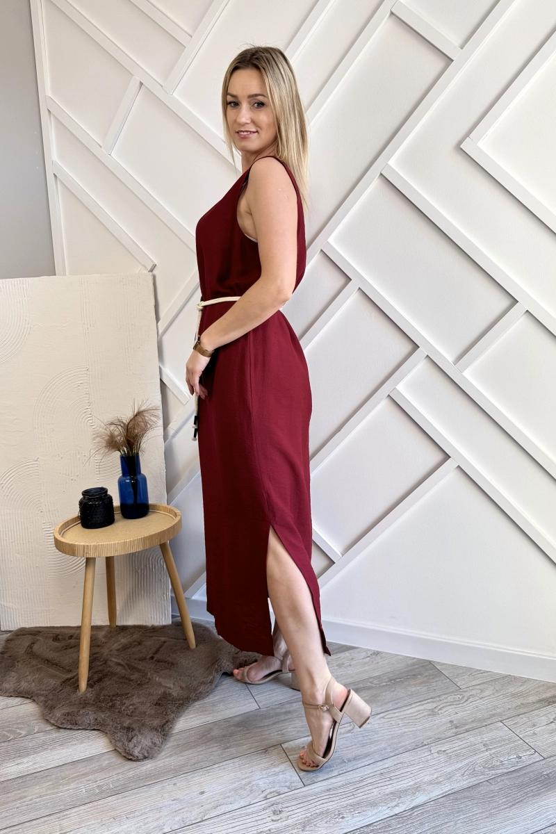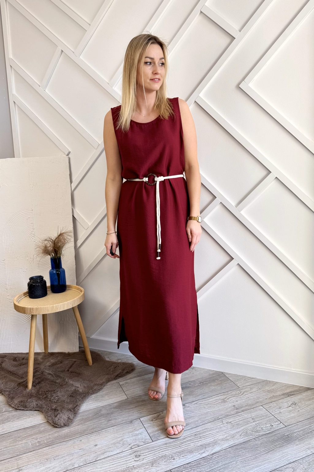 Długa sukienka w kolorze bordowym to propozycja na cieplejsze wiosenno-letnie dni. Sukienka bez rękawów, na szerokich ramiączkach z okrągłym dekoltem oraz niewielkimi rozcięciami na dole. Dodatkowo do sukienki dołączony jest pasek, dzięki czemu można ładnie podkreślić talię.