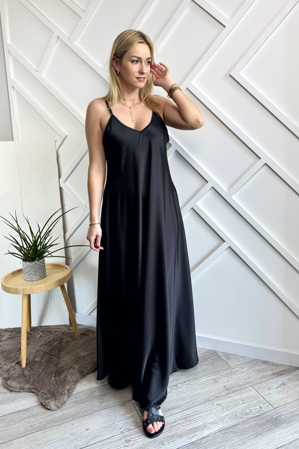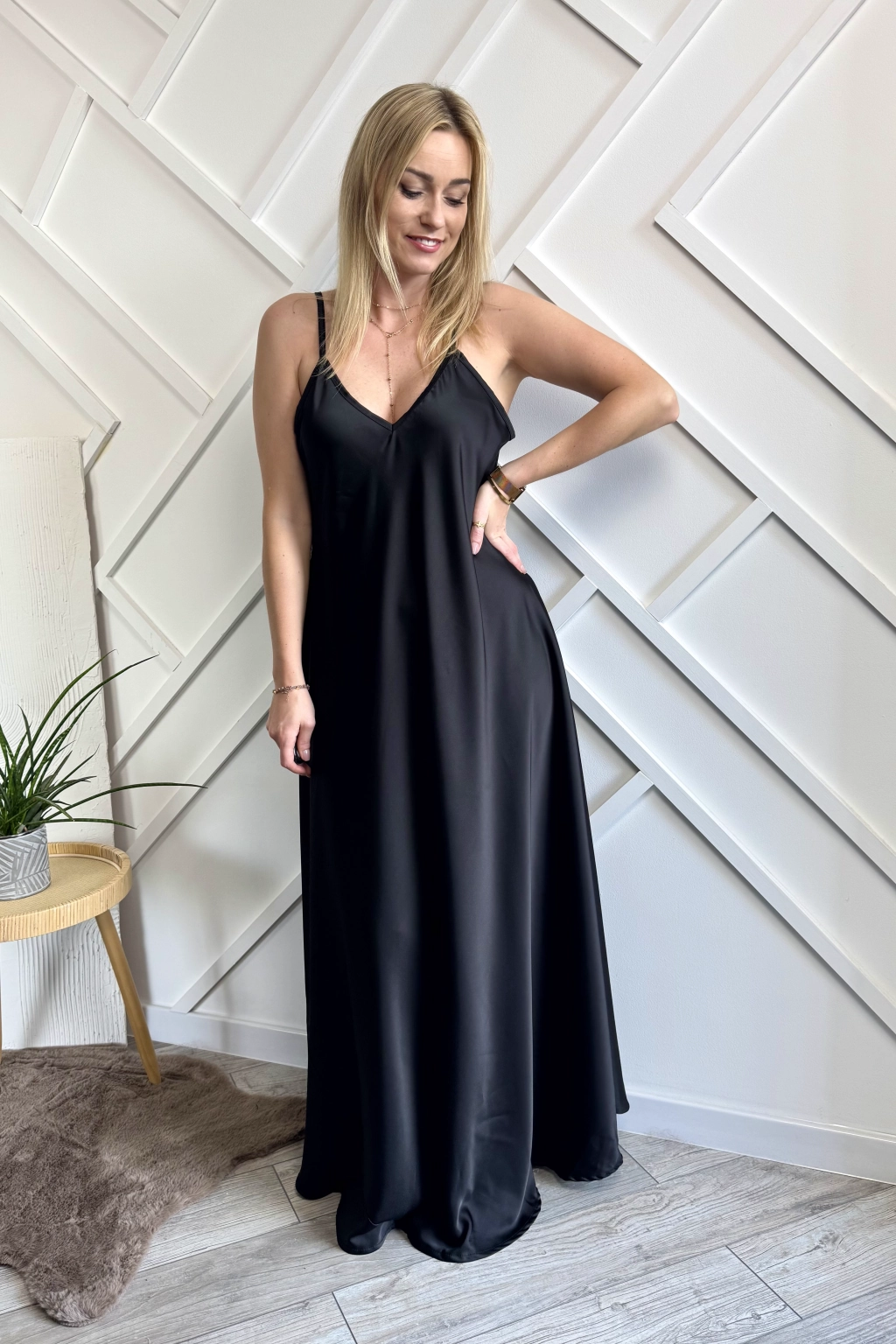 Długa czarna satynowa sukienka to elegancka propozycja na cieplejsze dni. Sukienka na delikatnych, cienkich ramiączkach z dekoltem w literę V wykończonym lamówką dzięki wycięciom na dekolcie i na plecach wydaje się być lekka i zwiewna. Dół sukienki nie jest jednolity, wszyta jest dodatkowa wstawka, co daje lekką asymetrię. Dół sukienki mocno rozkloszowany. Można nosić z paskiem, co ładnie podkreśli talię.