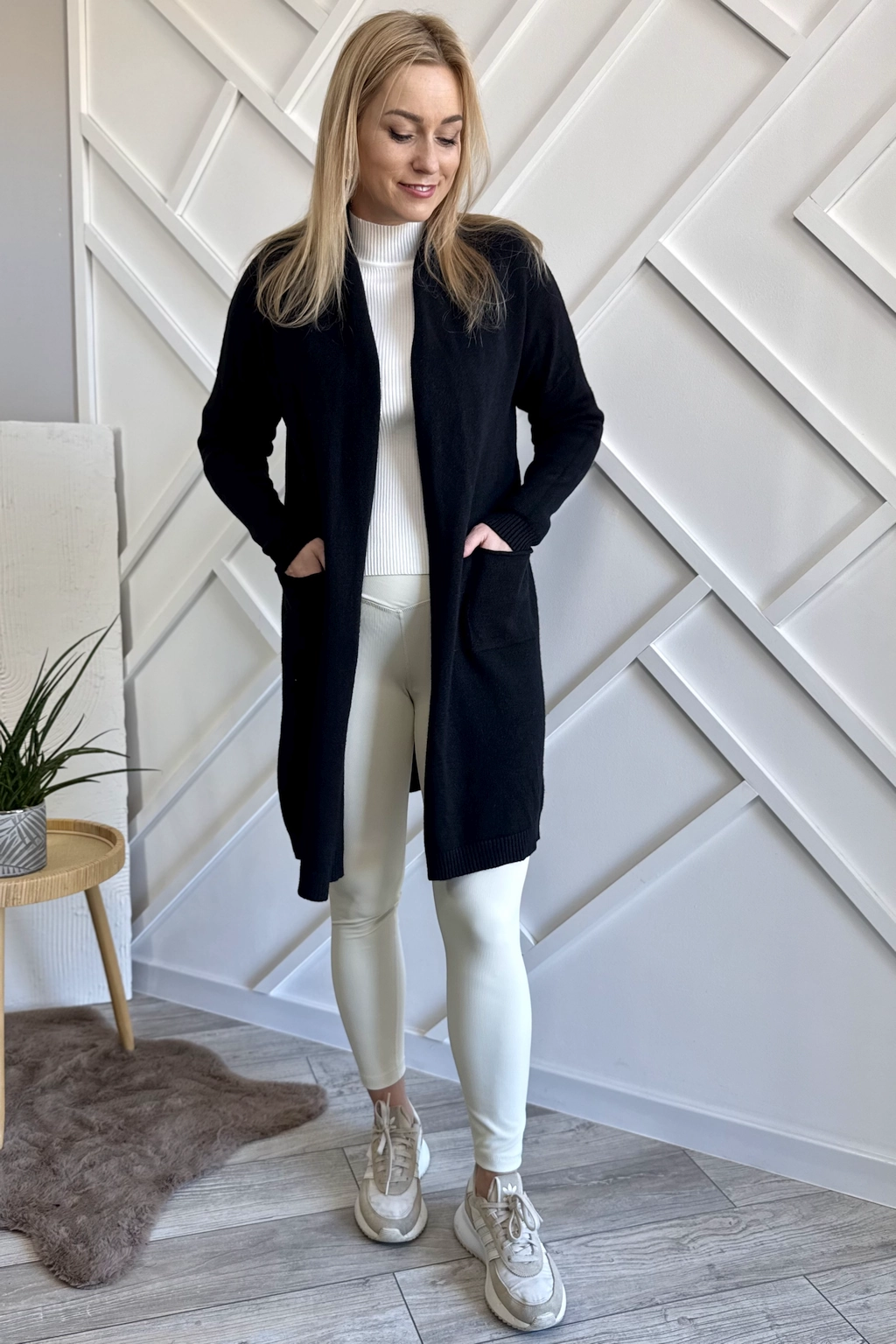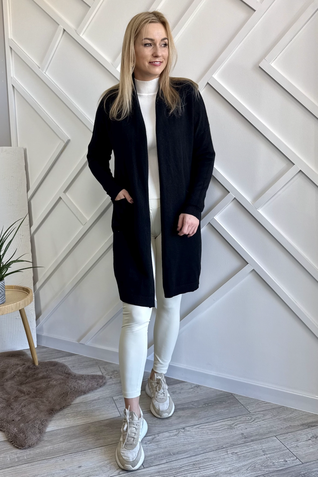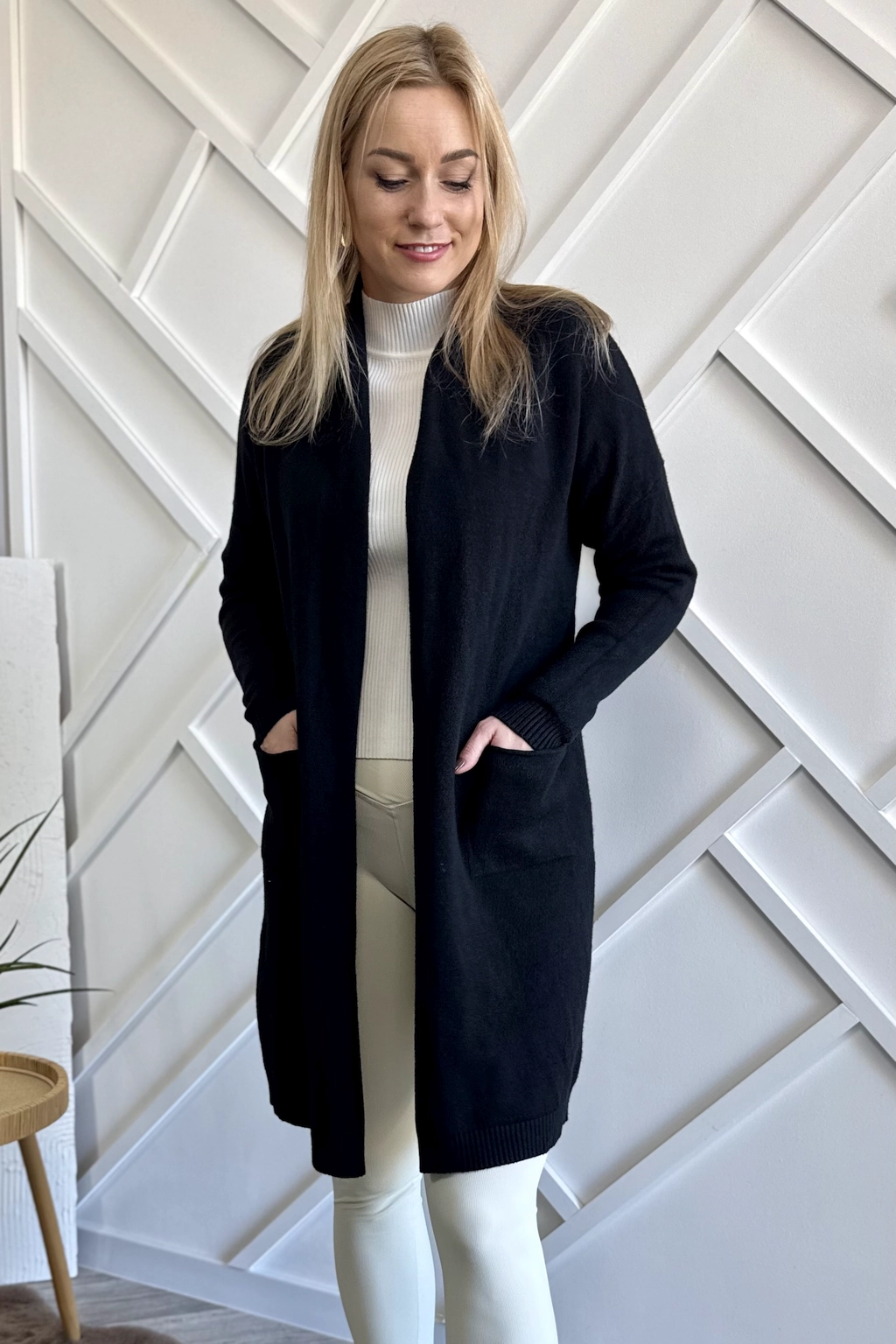 Długi czarny sweter damski typu kardigan, bez zapięcia, dodatkowo z kieszeniami. Sweter wykończony na surowo. Dzianina mięsista i przyjemna dla skóry. Klasyczny kardigan – narzutka, który na pewno zagości w Twojej szafie na wiele sezonów.