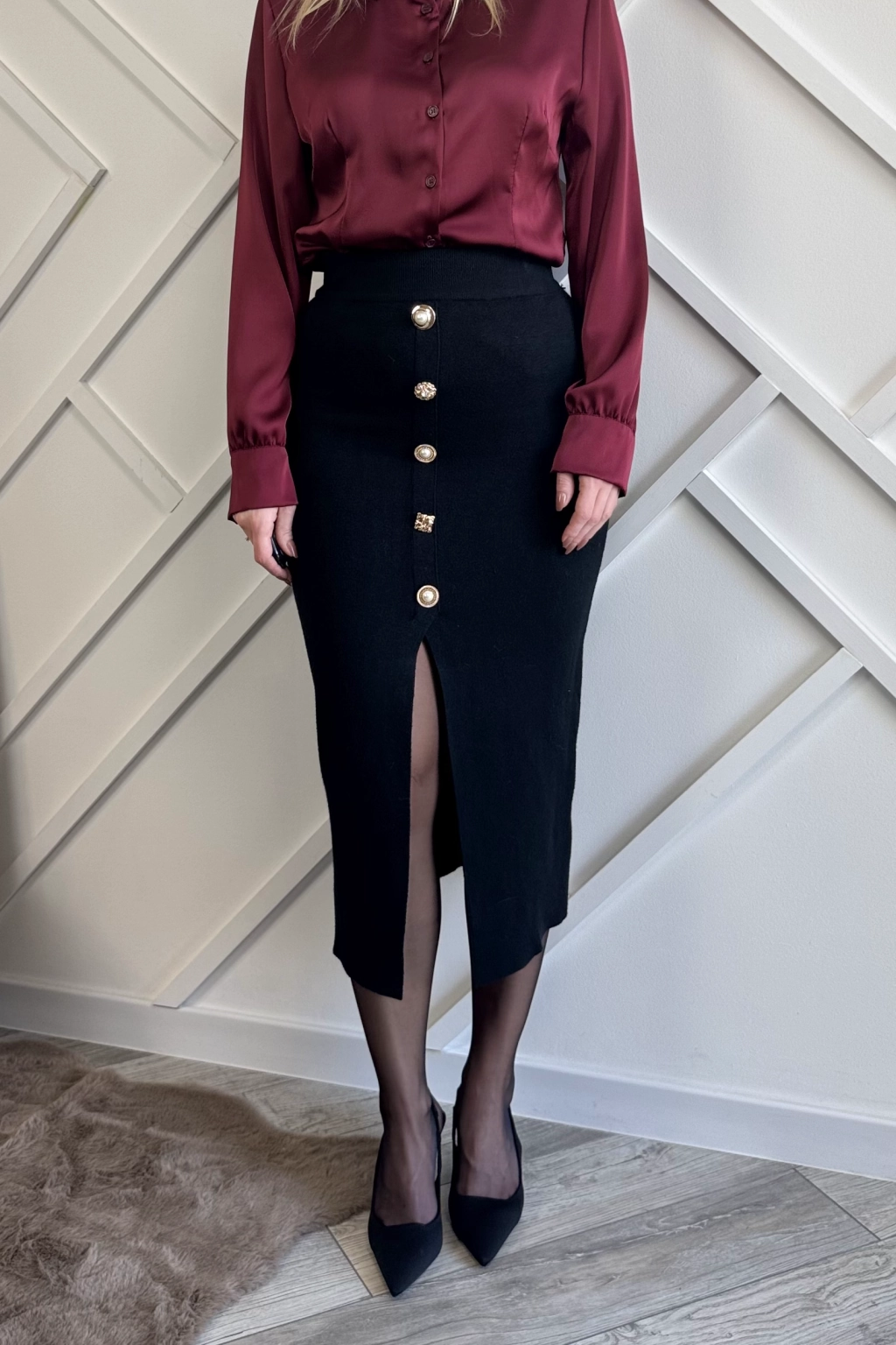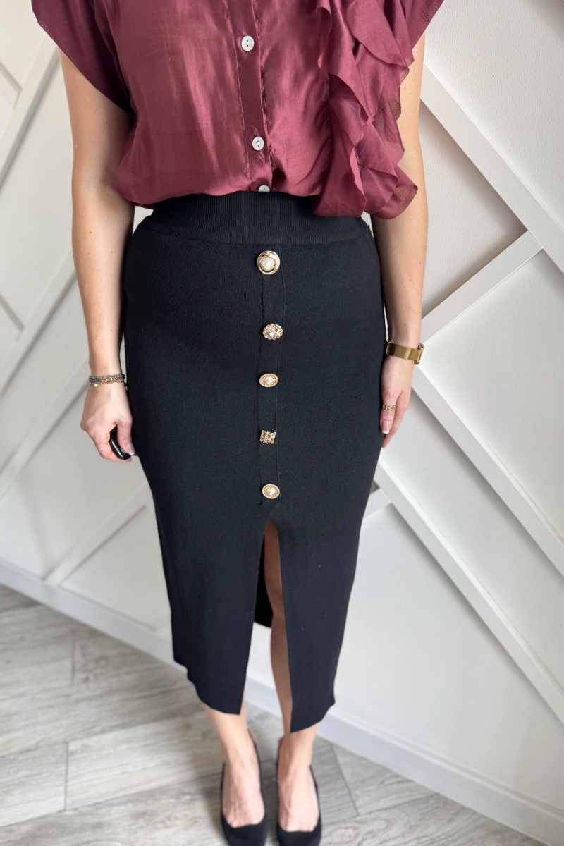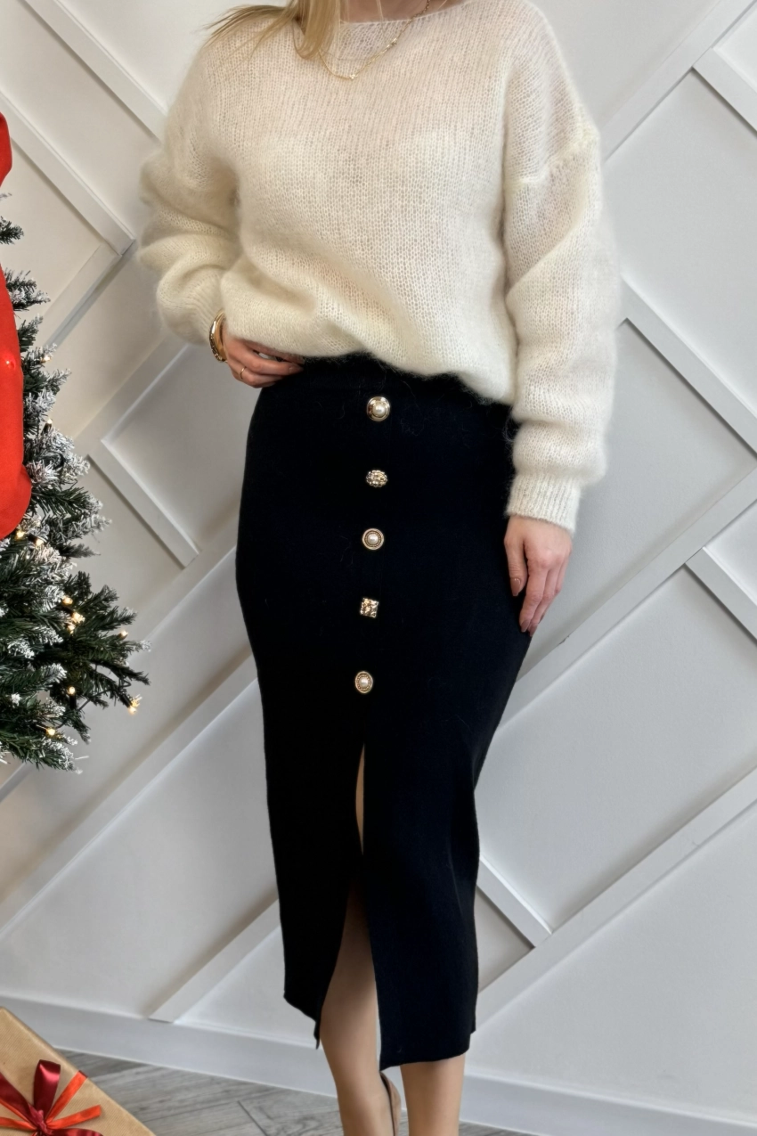 Czarna dzianinowa spódnica midi to klasyka, która nigdy nie wychodzi z mody, dodatkowo tutaj macie fajne rozcięcie i ozdobne guziki.