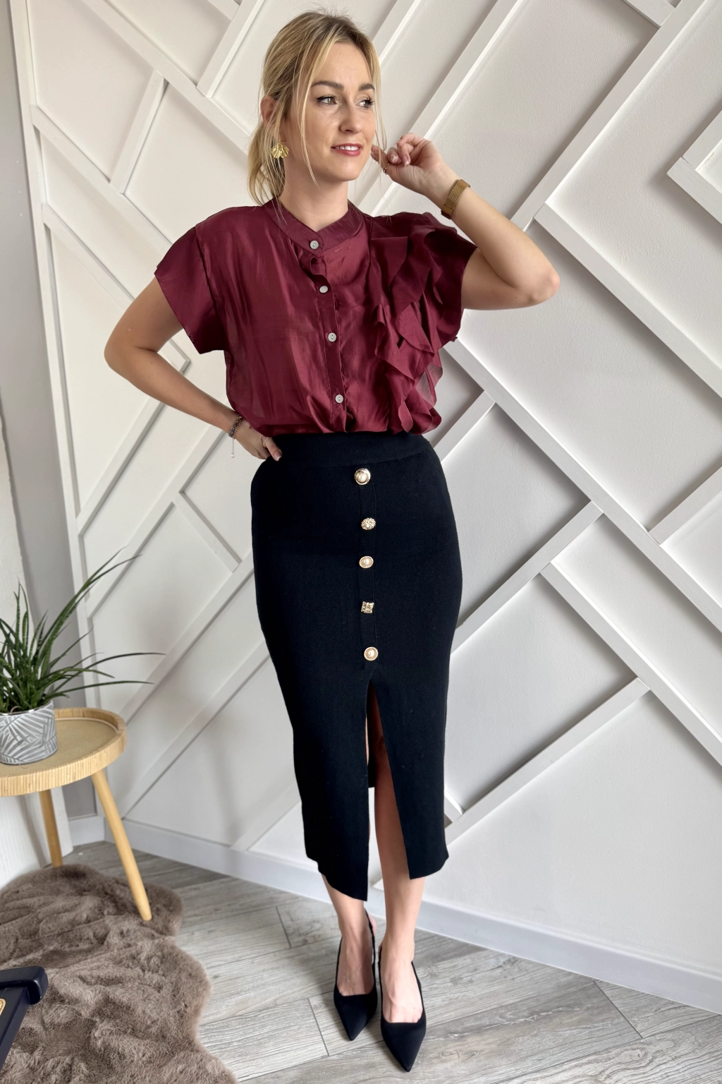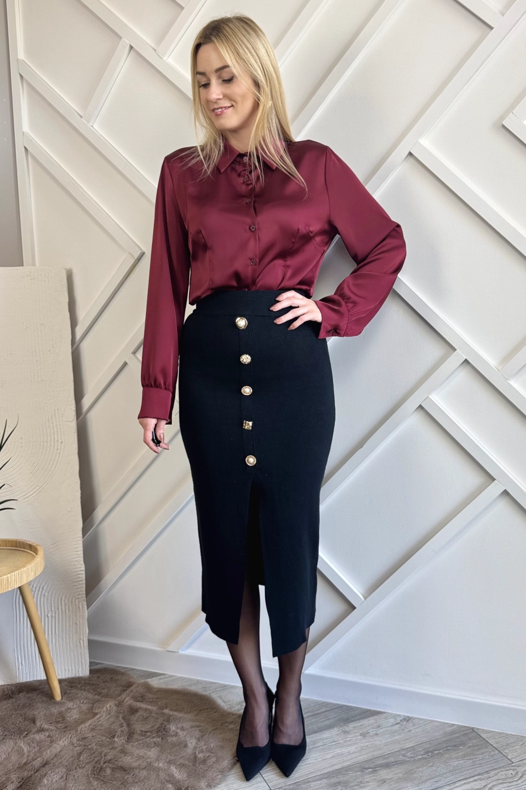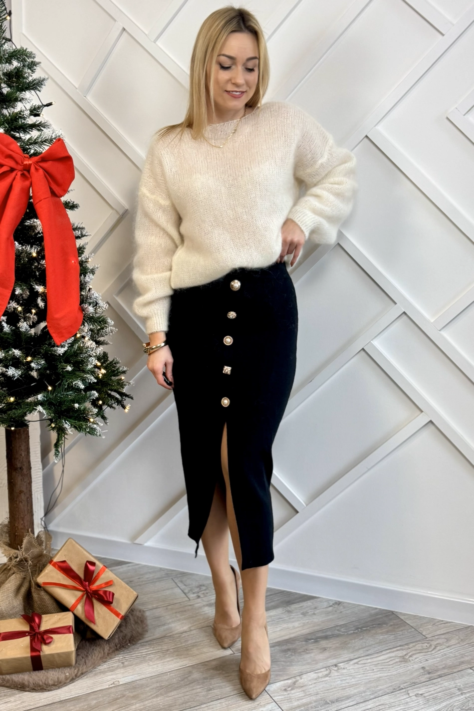 Czarna dzianinowa spódnica midi to klasyka, która nigdy nie wychodzi z mody, dodatkowo tutaj macie fajne rozcięcie i ozdobne guziki.