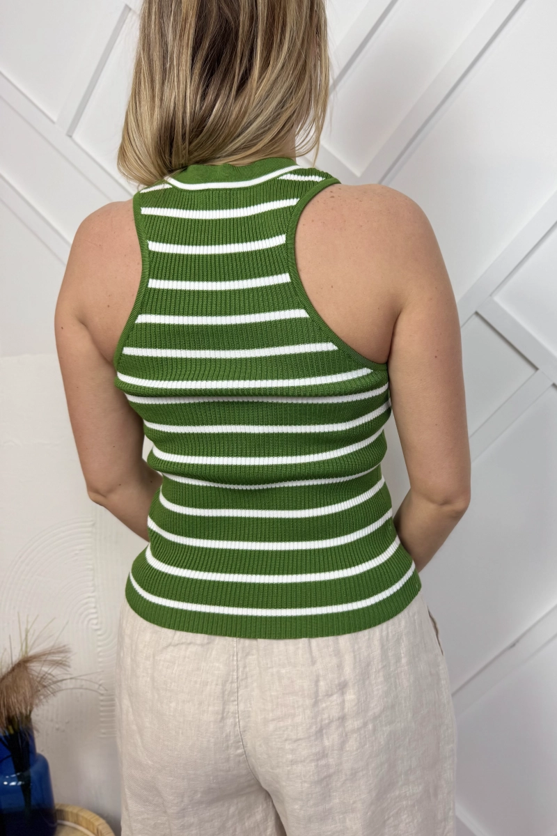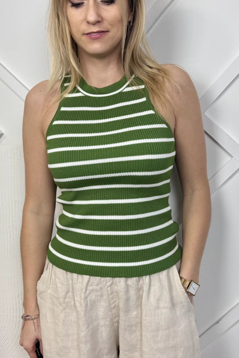 Top dzianinowy typu halter w paski w kolorze zielono-białym. Świetnie sprawdzi się jako baza do gładkich marynarek czy kardiganów. Natomiast na lato będzie pasować jako top do spodenek. Materiał dzianinowy, bardzo elastyczny i przyjemny dla ciała.