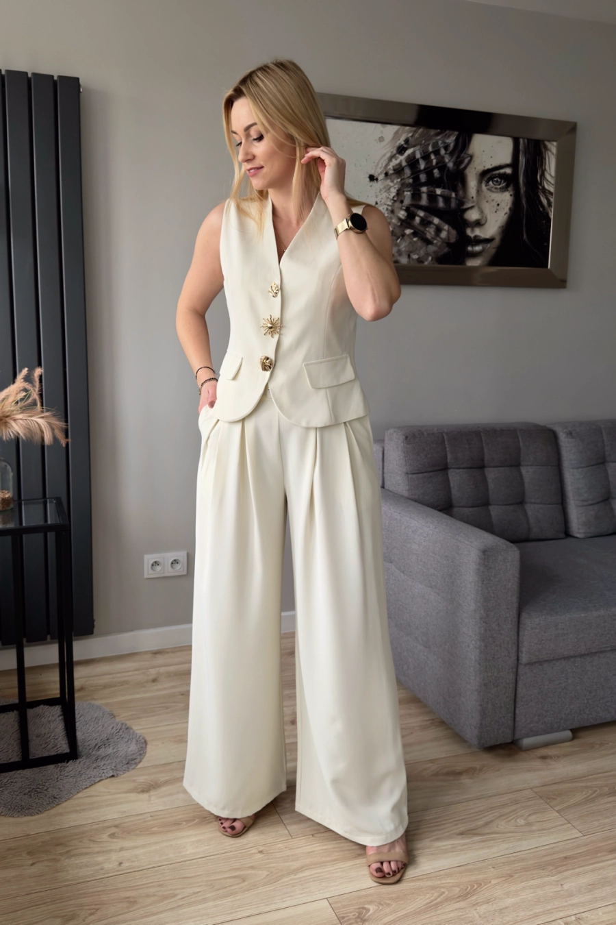 Biały komplet damski składający z szerokich spodni oraz kamizelki. Spodnie z szerokimi nogawkami, z zakładkami z przodu, zapinane na zamek z tył. Dodatkowo spodnie z wyższym stanem i paskiem, co ładnie podkreśli talię.