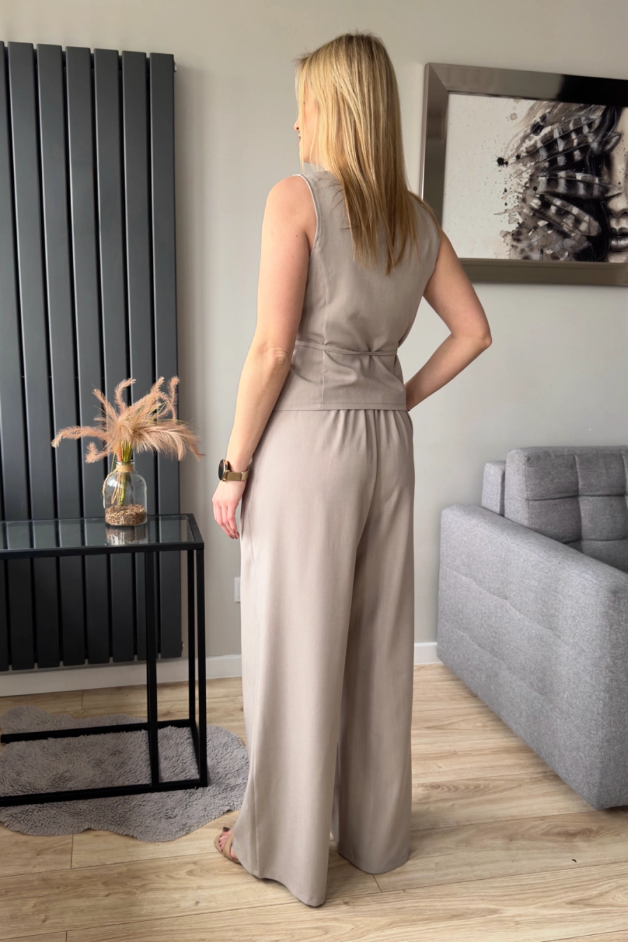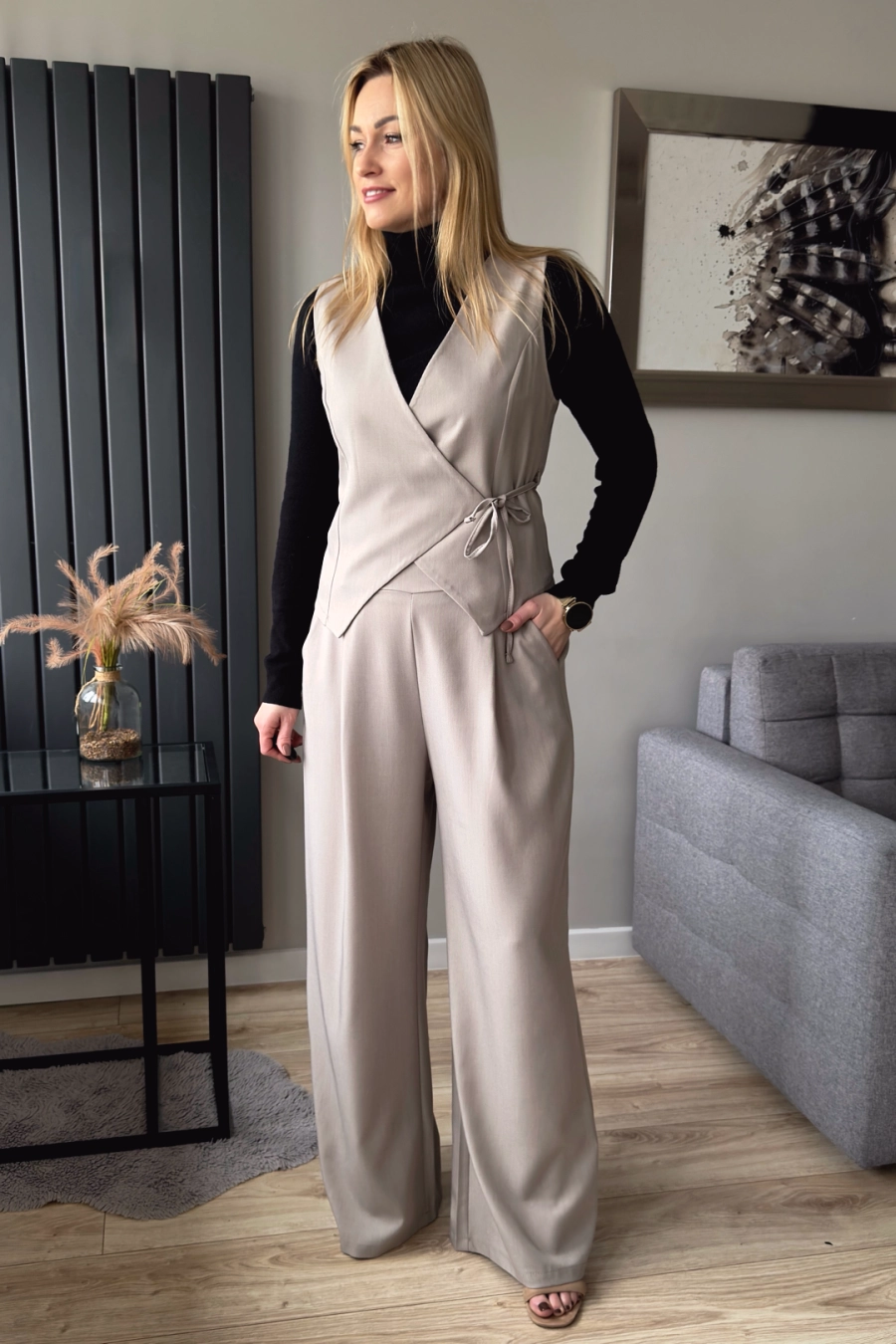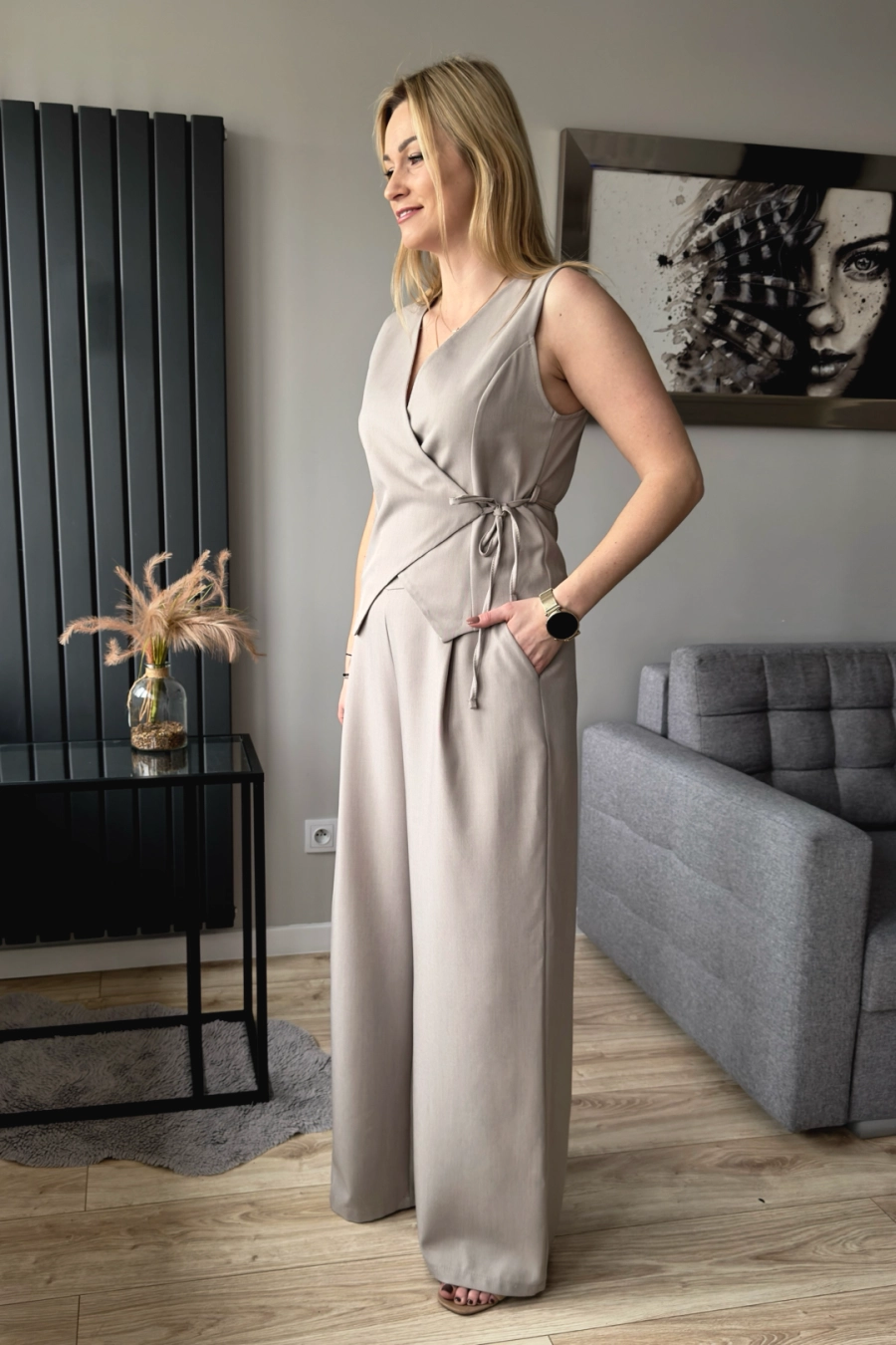 Beżowy komplet damski składający z szerokich spodni oraz kamizelki wiązanej z przodu. Spodnie z szerokimi nogawkami, z tył w psie jest gumka, przód natomiast gładki – bardziej elegancki. Kamizelka natomiast jest o kopertowym dekolcie – przekładana i wiązana w talii.