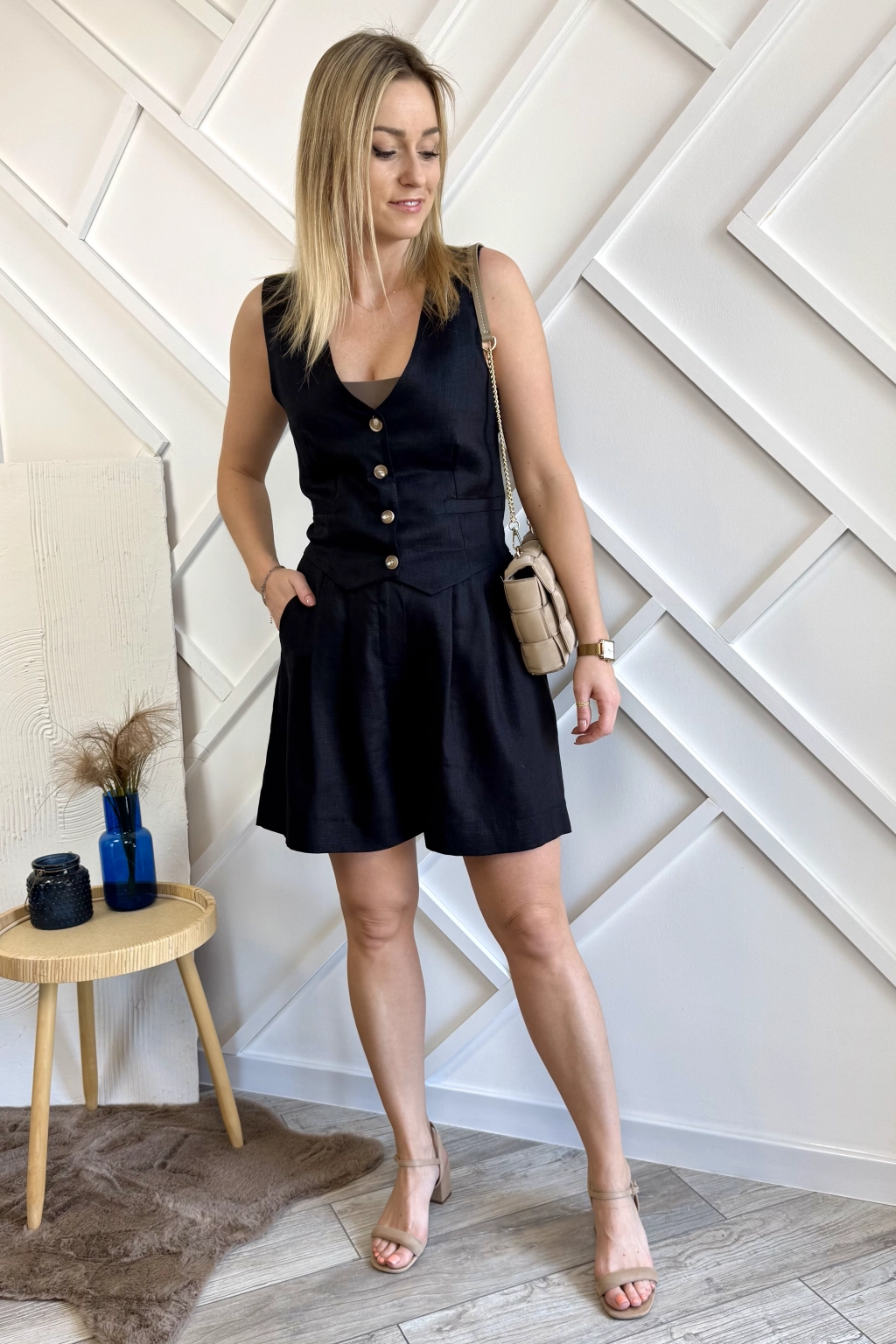 Czarny komplet damski składający z krótkich spodenek oraz kamizelki. Spodnie z szerokimi nogawkami, zapinane na zamek i guzik, z tył mają gumę. Dodatkowo spodenki mają kieszenie. Ponadto nogawki o dłuższym kroju – sięgają do połowy uda. Kamizelka natomiast jest o dopasowanym kroju, zapinana na 4 guziki.