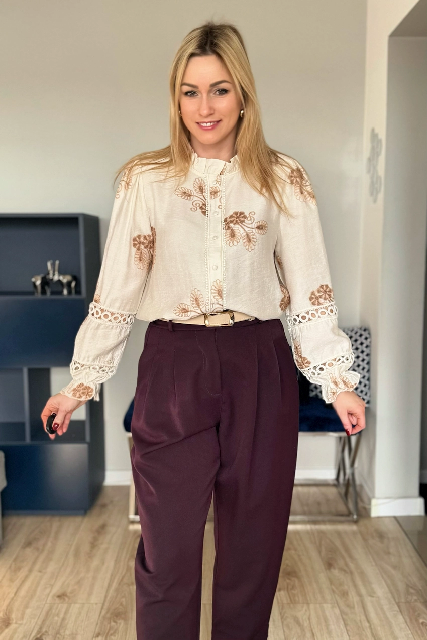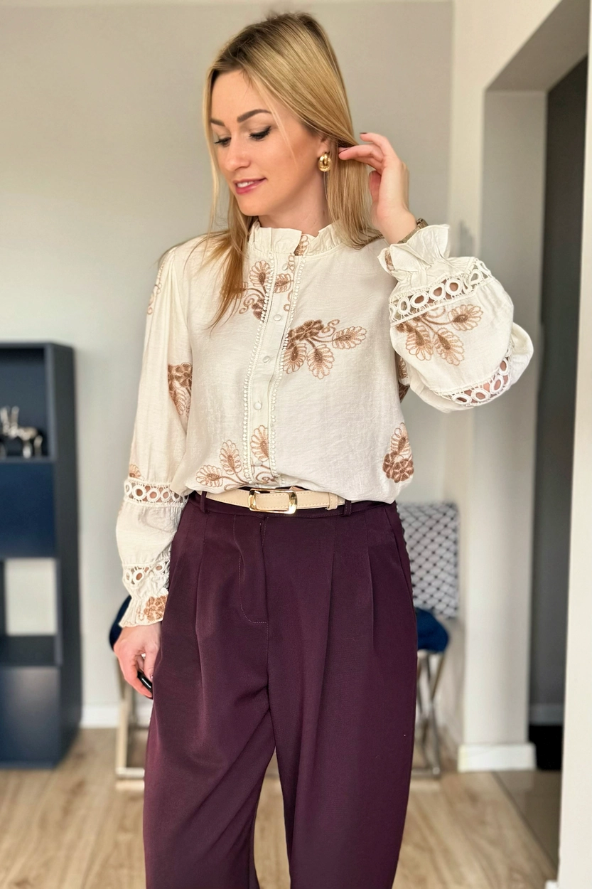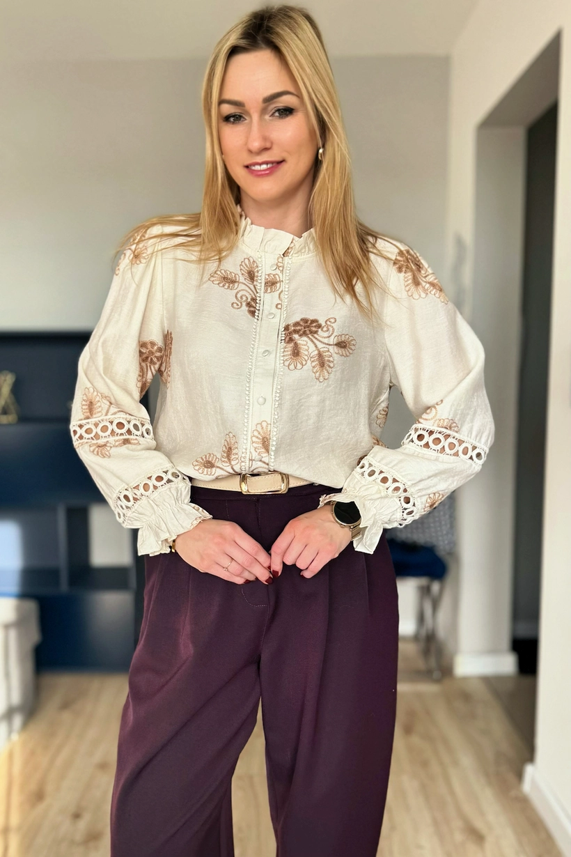 Przepiękna beżowa koszula z brązowymi haftami w stylu BOHO. Koszula zapinana na guziki bez kołnierzyka z delikatną falbanką przy szyi. Koszulę zdobią liczne hafty, a także ażurowe wstawki. Ponadto przepięknie zdobione rękawy, nieco szersze zakończone gumką i falbanką.