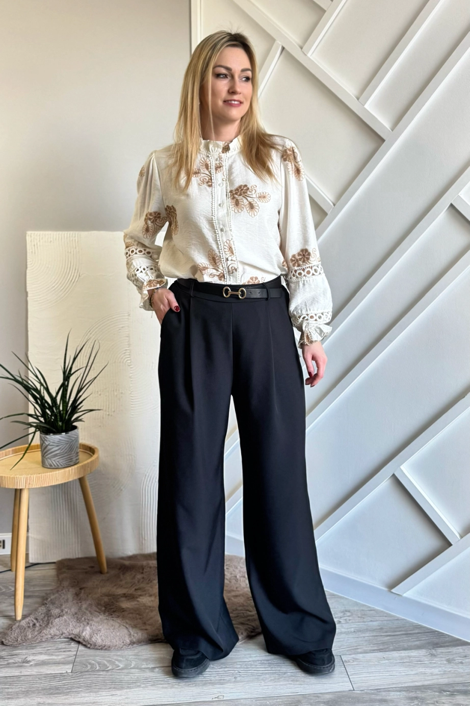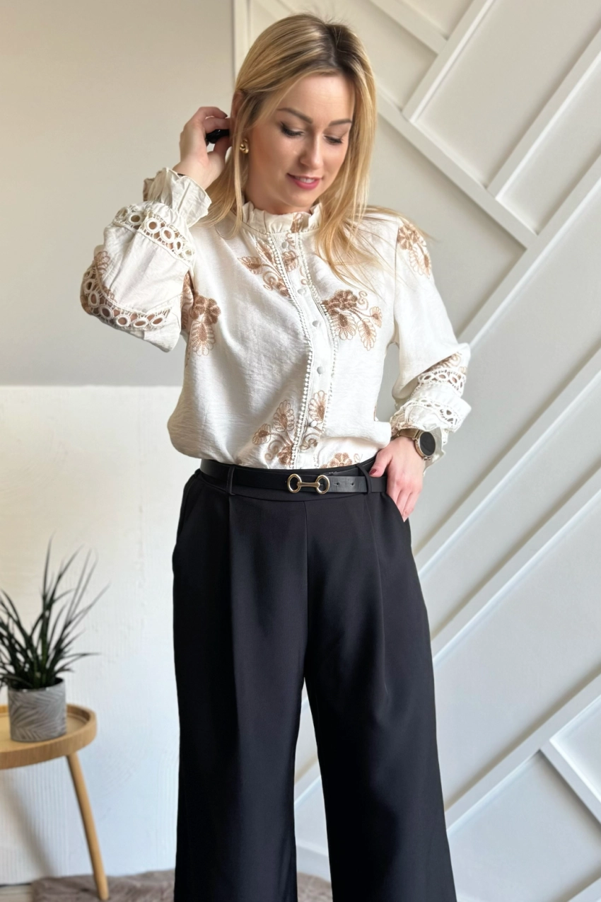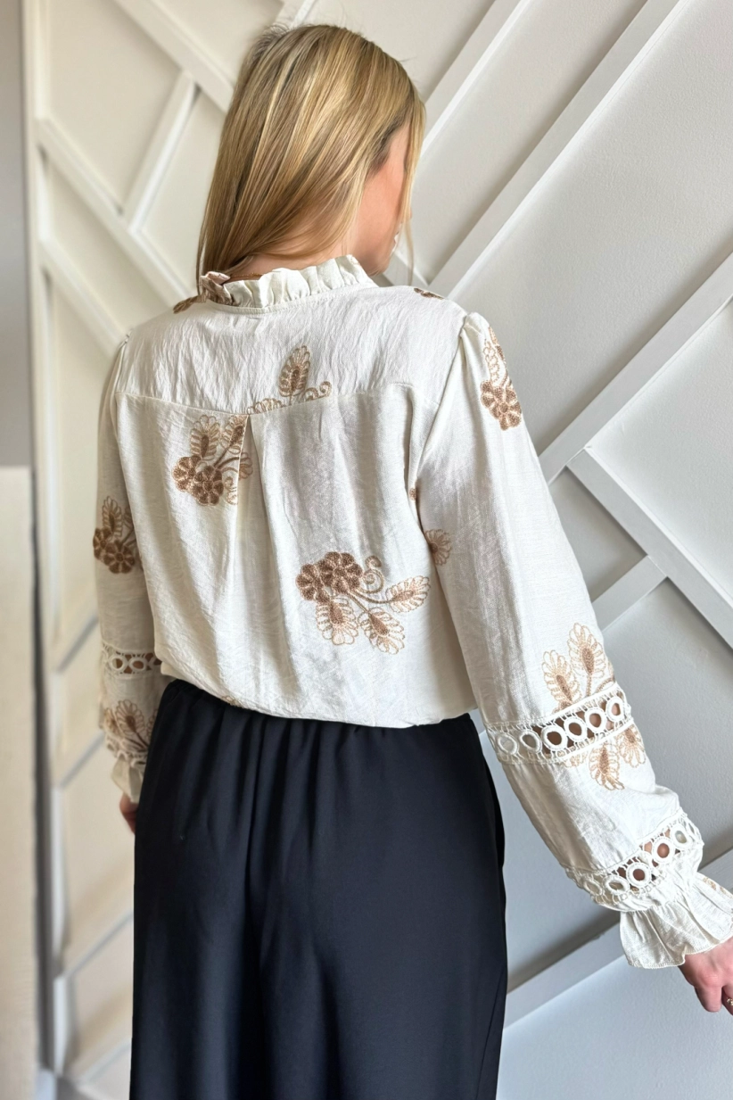 Przepiękna beżowa koszula z brązowymi haftami w stylu BOHO. Koszula zapinana na guziki bez kołnierzyka z delikatną falbanką przy szyi. Koszulę zdobią liczne hafty, a także ażurowe wstawki. Ponadto przepięknie zdobione rękawy, nieco szersze zakończone gumką i falbanką.