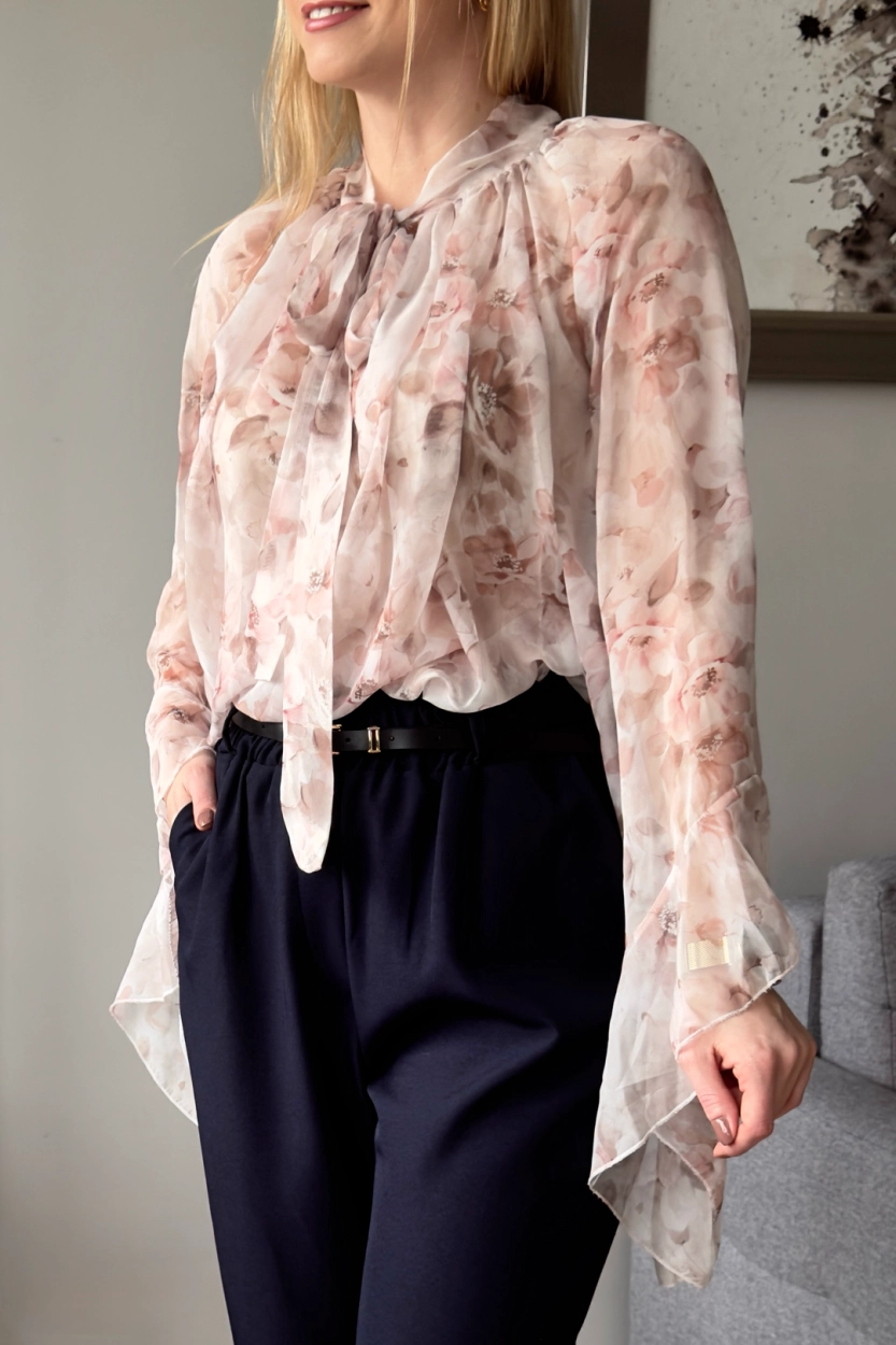 Zwiewana koszula damska z lekkiego materiału typu mgiełka. Koszula z przodu posiada kokardę do wiązania. Szerokie rękawy wykończone falbanką, dzięki czemu koszula nadaje stylizacji lekkości. Ponadto koszula uszyta z bardzo lekkiego, przewiewnego materiału niczym mgiełka – nie będziesz jej czuła na ciele.