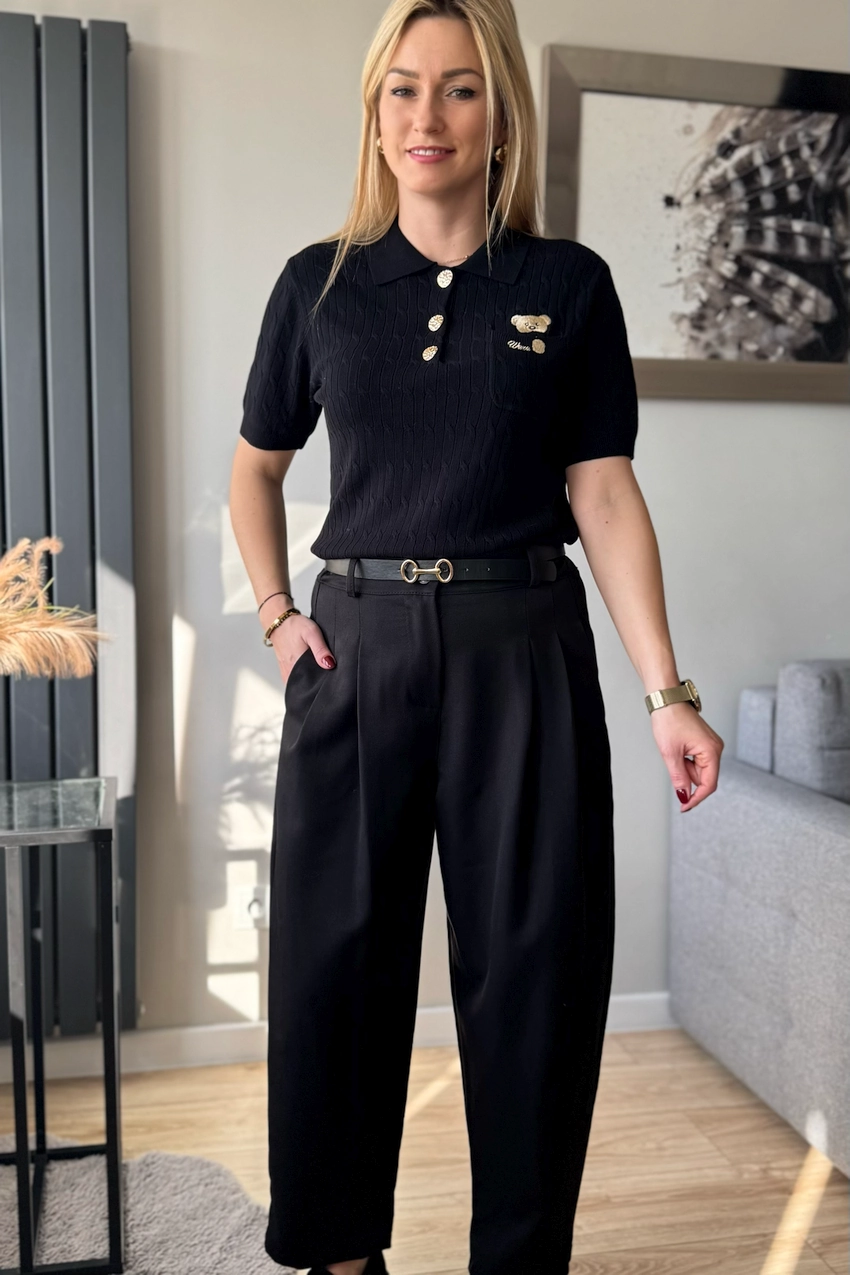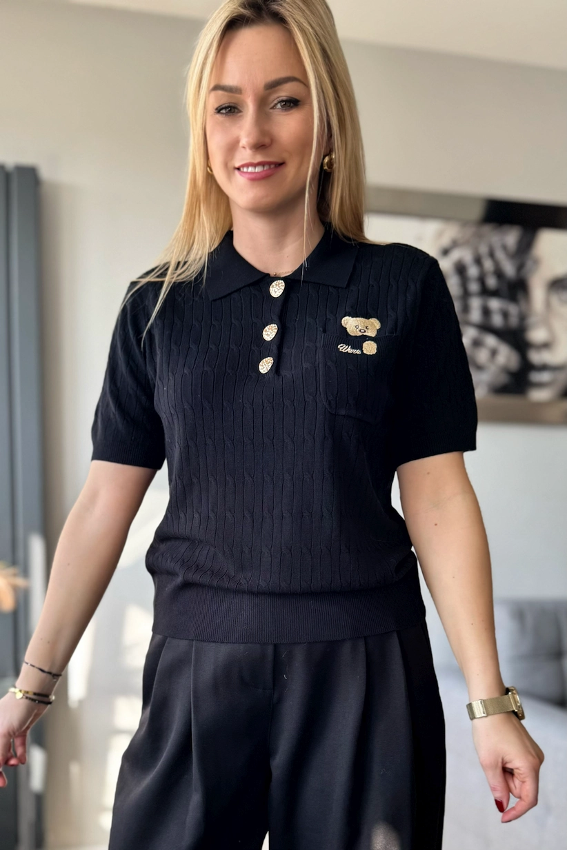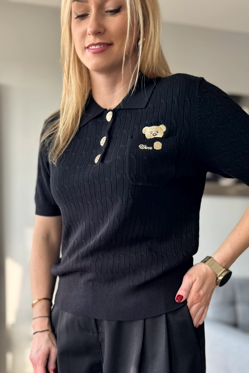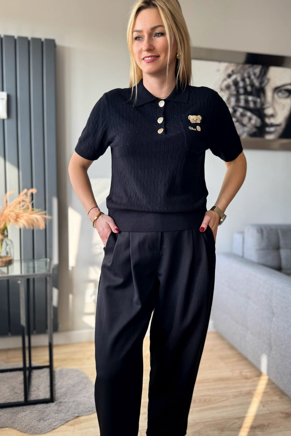 Czarna bluzka koszulka damska z kołnierzykiem polo. Dzianinowa bluzka z kołnierzykiem zapinana na złote ozdobne guziki. Dodatkowo ozdobna kieszonka, z której wystaje misio. Ponadto fajna sweterkowa tkanina z wyraźnym splotem. Tkanina mocno elastyczna. Przyjemna wiskozowa „polówka”, która sprawdzi się w codziennych stylizacjach, zarówno do pracy jak i na spacer, czy zakupy.