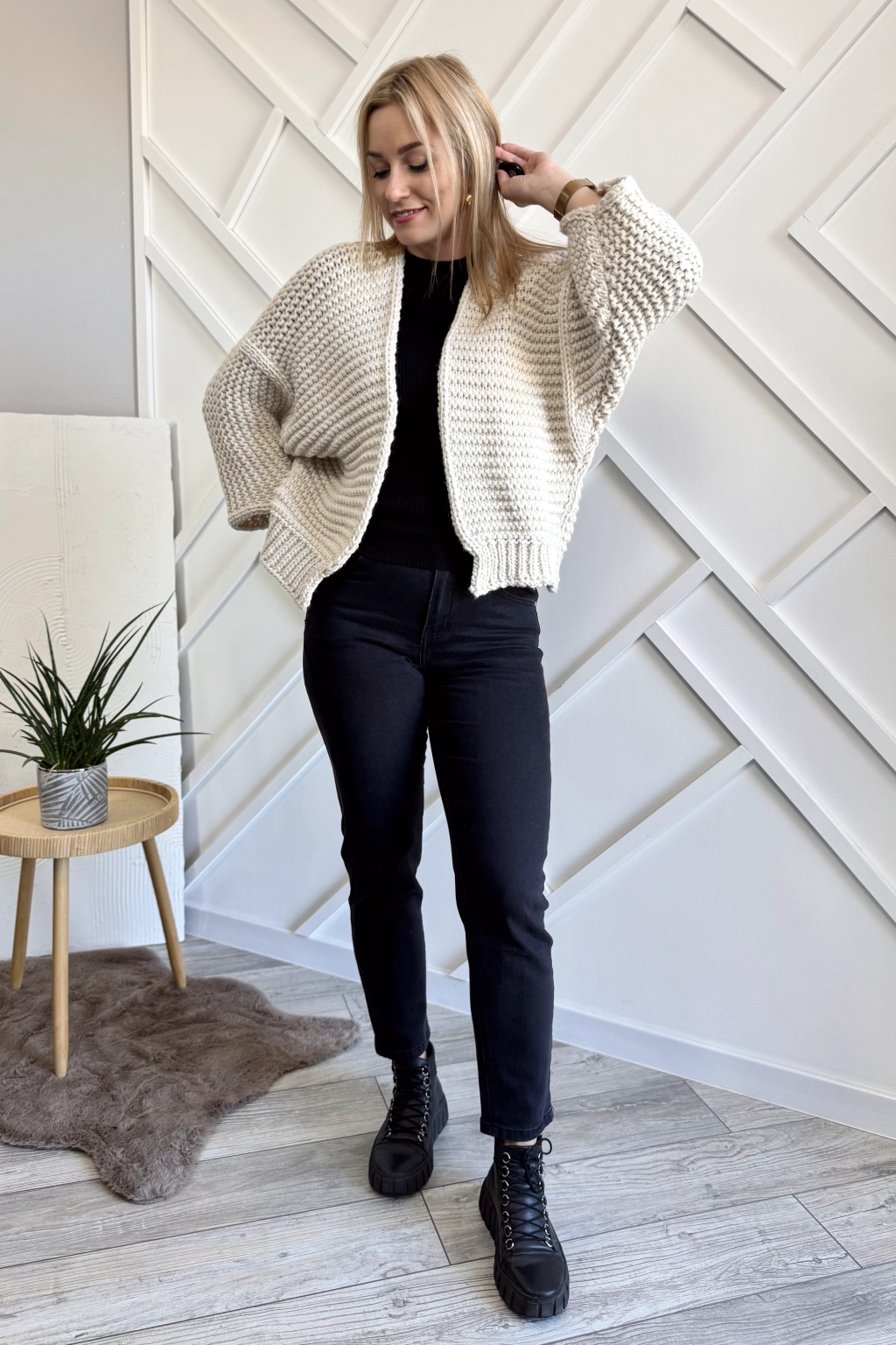 Beżowy krótki kardigan wykorzystasz jako narzutkę do Twojej stylizacji – i do sukienki i do spodni 😉 Ten ciepły sweter to idealna propozycja na jesienne i zimowe dni. Rozmiar uniwersalny.