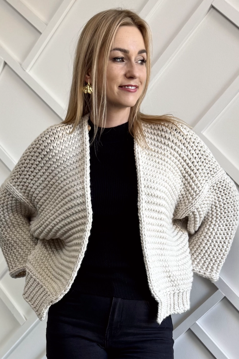 Pleciony krótki beżowy sweter damski typu kardigan, bez zapięcia. Wyraźny splot typu waflowy / ryżowy / gofrowy. Dzianina mięsista i przyjemna dla skóry.