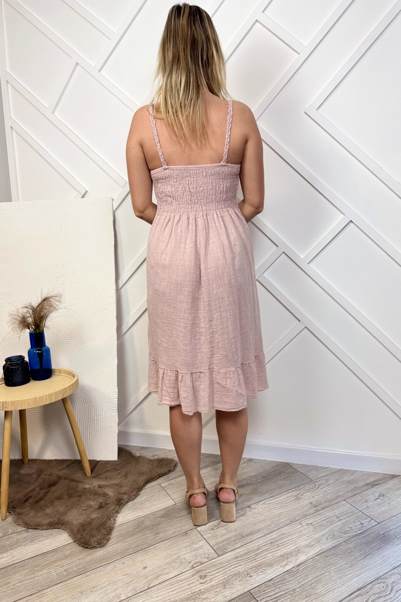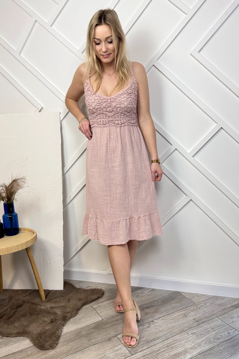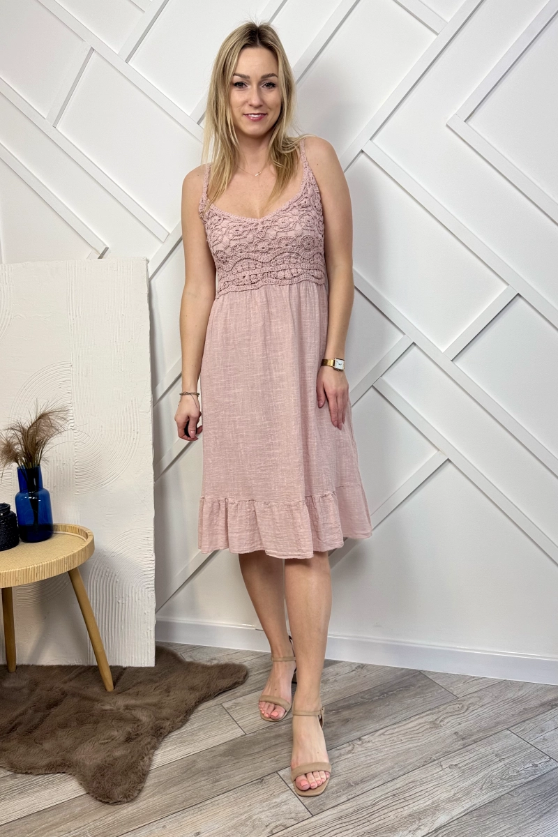 Letnia sukienka na ramiączkach w stylu boho, w całości bawełniana w kolorze pudrowego różu. Góra sukienki ozdobiona szydełkową wstawką. Na dole sukienka wykończona falbanką. Krój rozkloszowany. Na plecach jest gumka, dzięki czemu sukienka będzie się dopasowywać do różnych rozmiarów. Sukienka jest w 100% bawełniana, świetna opcja na lato – tkanina jest zwiewna, oddychająca. Dodatkowo bezpieczna długość sukienki – w zależności od wzrostu -sięga w okolice kolan.  Sukienka występuje w kilku kolorach.