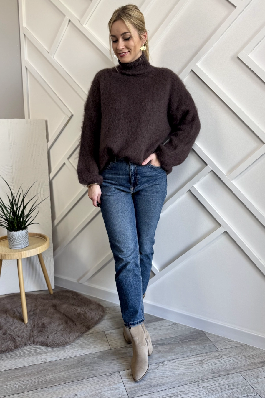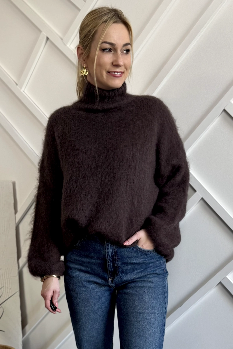 Moherowy sweter czekoladowy z golfem