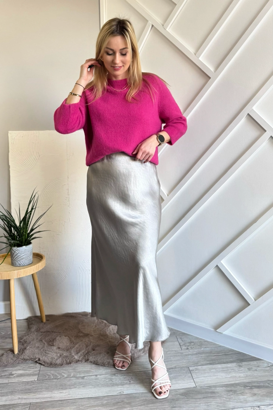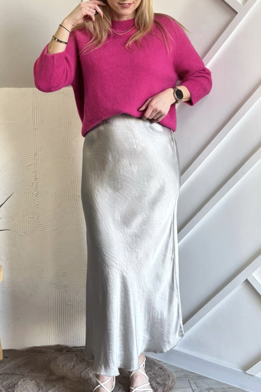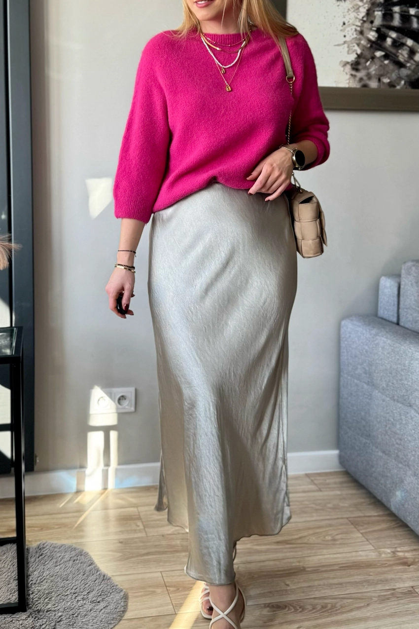 Beżowa satynowa spódnica midi to już klasyka i jest z nami od kilku sezonów, w tym również nie może zabraknąć tego modelu. A ty masz już swoją w szafie? Fajnie podkręca stylizacje nadając jej kobiecości i lekkości. A ten odcień beżu pięknie komponuje się ze wszystkimi kolorami: zarówno kontrastującymi, jak i stonowanymi.