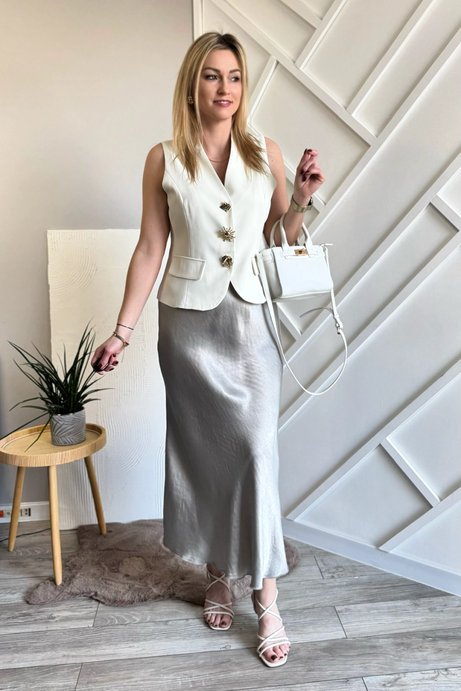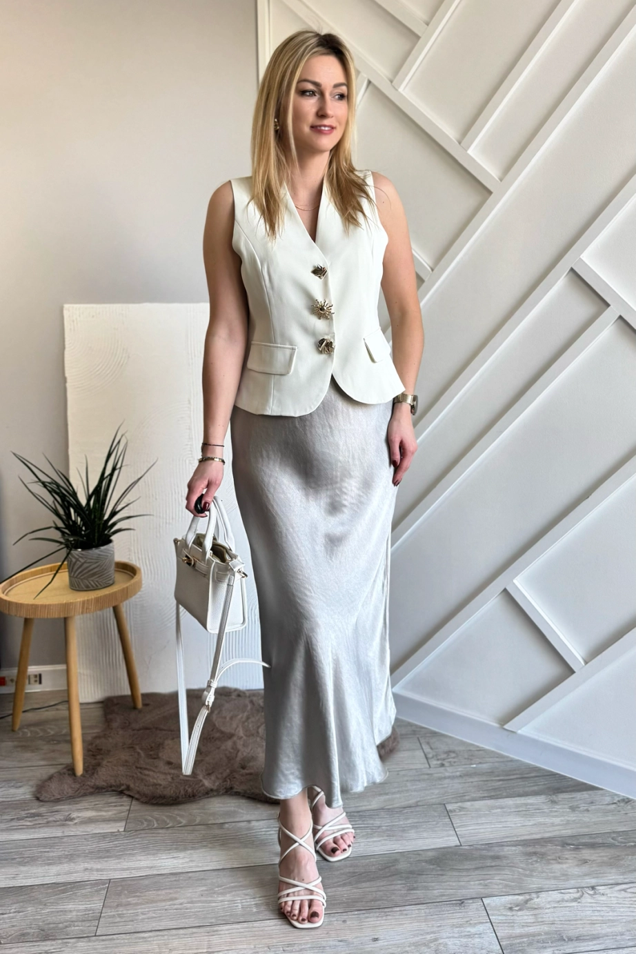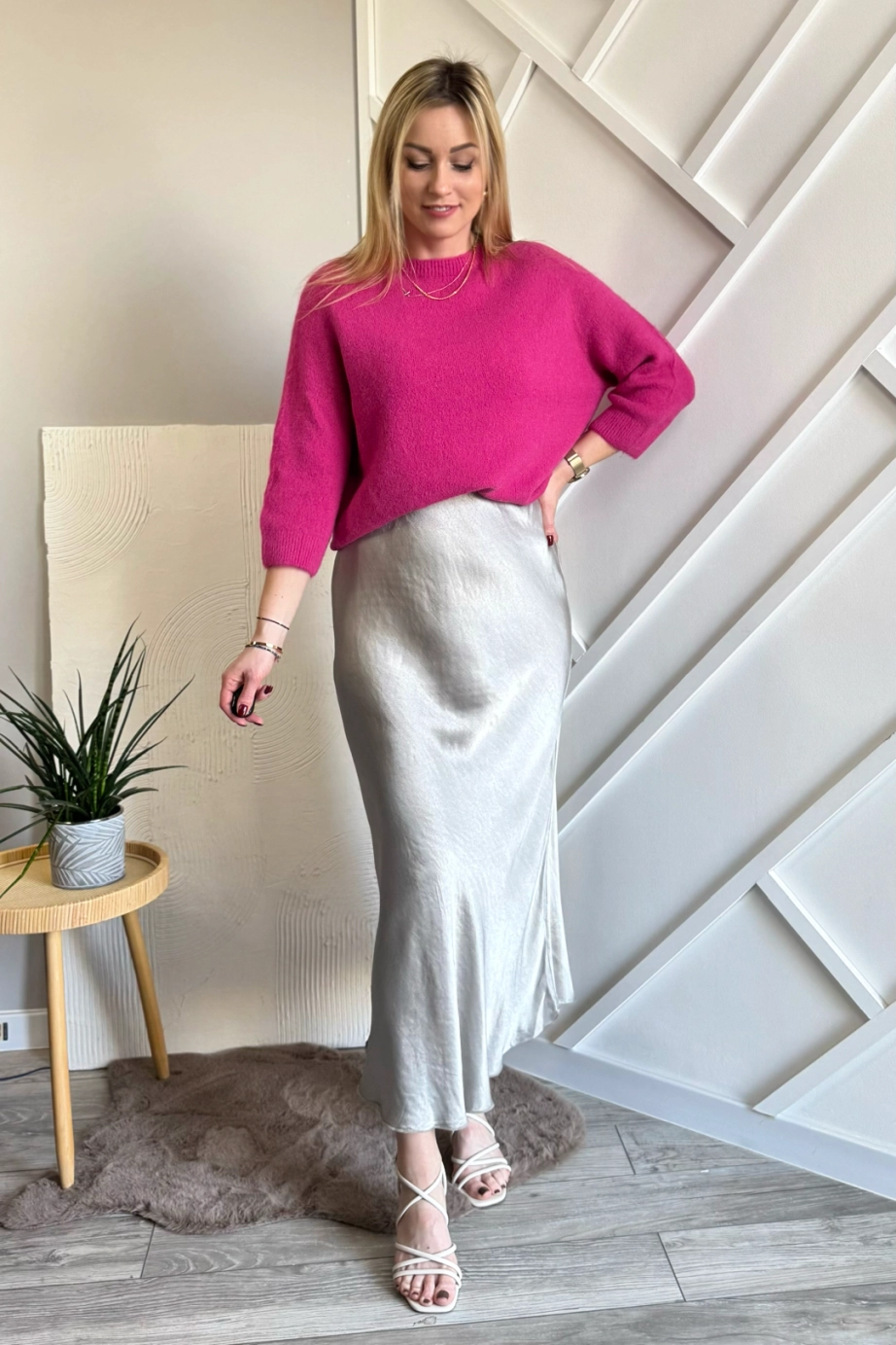 Beżowa satynowa spódnica midi to już klasyka i jest z nami od kilku sezonów, w tym również nie może zabraknąć tego modelu. A ty masz już swoją w szafie? Fajnie podkręca stylizacje nadając jej kobiecości i lekkości. A ten odcień beżu pięknie komponuje się ze wszystkimi kolorami: zarówno kontrastującymi, jak i stonowanymi.