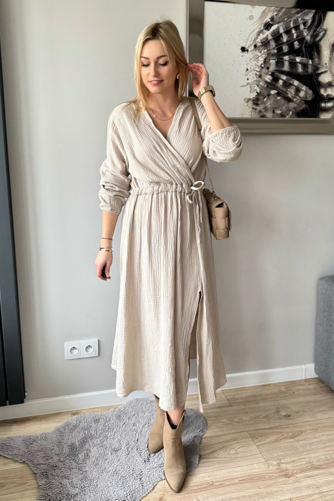 Beżowa sukienka do długości midi z efektownym rozcięciem na nogę. Rozcięcie sięga trochę powyżej kolana, więc można stwierdzić, że jest „bezpieczne” – nie odsłania za dużo. Na dodatek dekolt sukienki jest kopertowy, co optycznie wyszczupla. Dodatkowym atutem sukienki jest sznureczek w talii do wiązania – dzięki temu sukienkę można dopasować do swojej sylwetki. Świetnie poradzi sobie z ciążowym brzuszkiem, czy też z większym biustem 😉