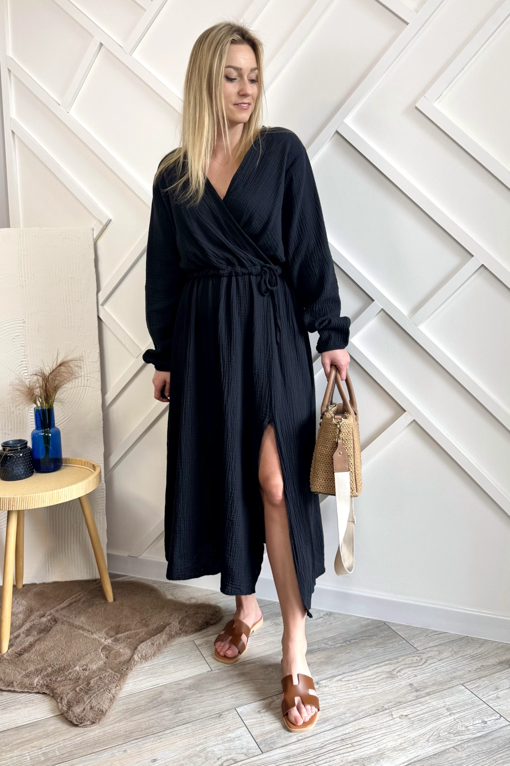 Czarna sukienka do długości midi z efektownym rozcięciem na nogę. Rozcięcie sięga trochę powyżej kolana, więc można stwierdzić, że jest „bezpieczne”. Na dodatek dekolt sukienki jest kopertowy, co optycznie wyszczupla. Dodatkowym atutem sukienki jest sznureczek w talii do wiązania – dzięki temu sukienkę można dopasować do swojej sylwetki. Świetnie poradzi sobie z ciążowym brzuszkiem, czy też z większym biustem 😉
