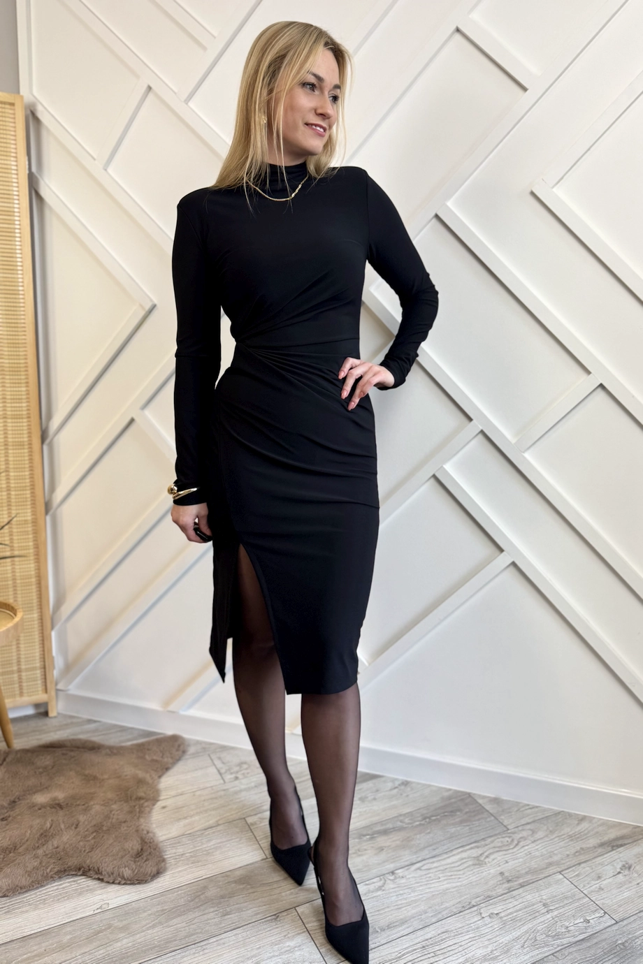 Sukienka długości  midi na długi rękaw z półgolfem. Niewielkie rozcięcie z przodu,  dzięki czemu swobodnie można się poruszać i tańczyć ;D. Dodatkowo sukienka ma wszyte poduszki w ramionach, co optycznie nadaje sylwetce fajnych proporcji. Ponadto sukienka z przodu ma drapowany marszczony materiał, co optycznie: – po pierwsze – zwęża talię, a po drugie – odciąga wzrok od brzuszka.  Kobiecy fason podkreśla figurę, natomiast elastyczny materiał gwarantuje dopasowanie do sylwetki oraz komfort.