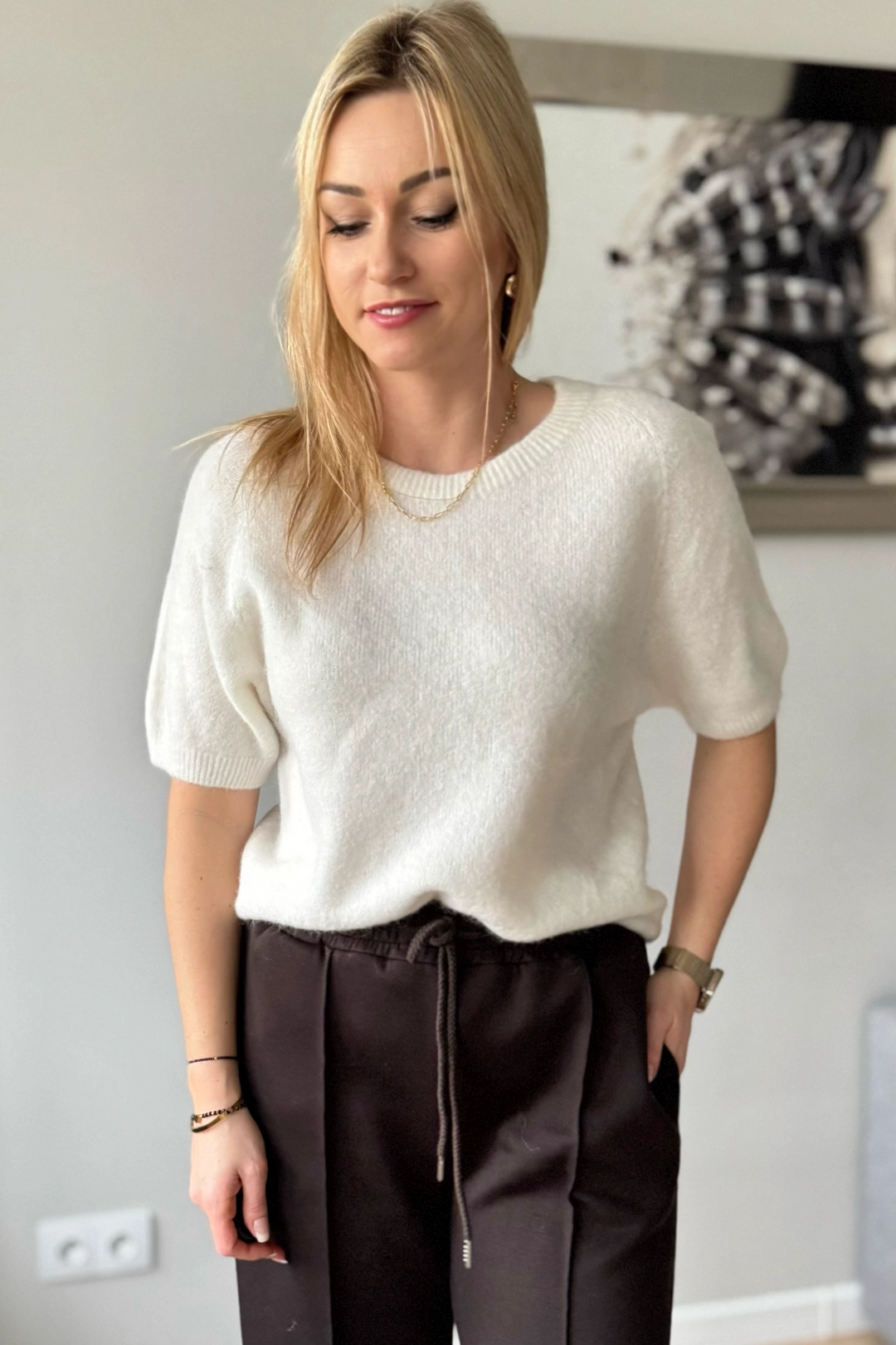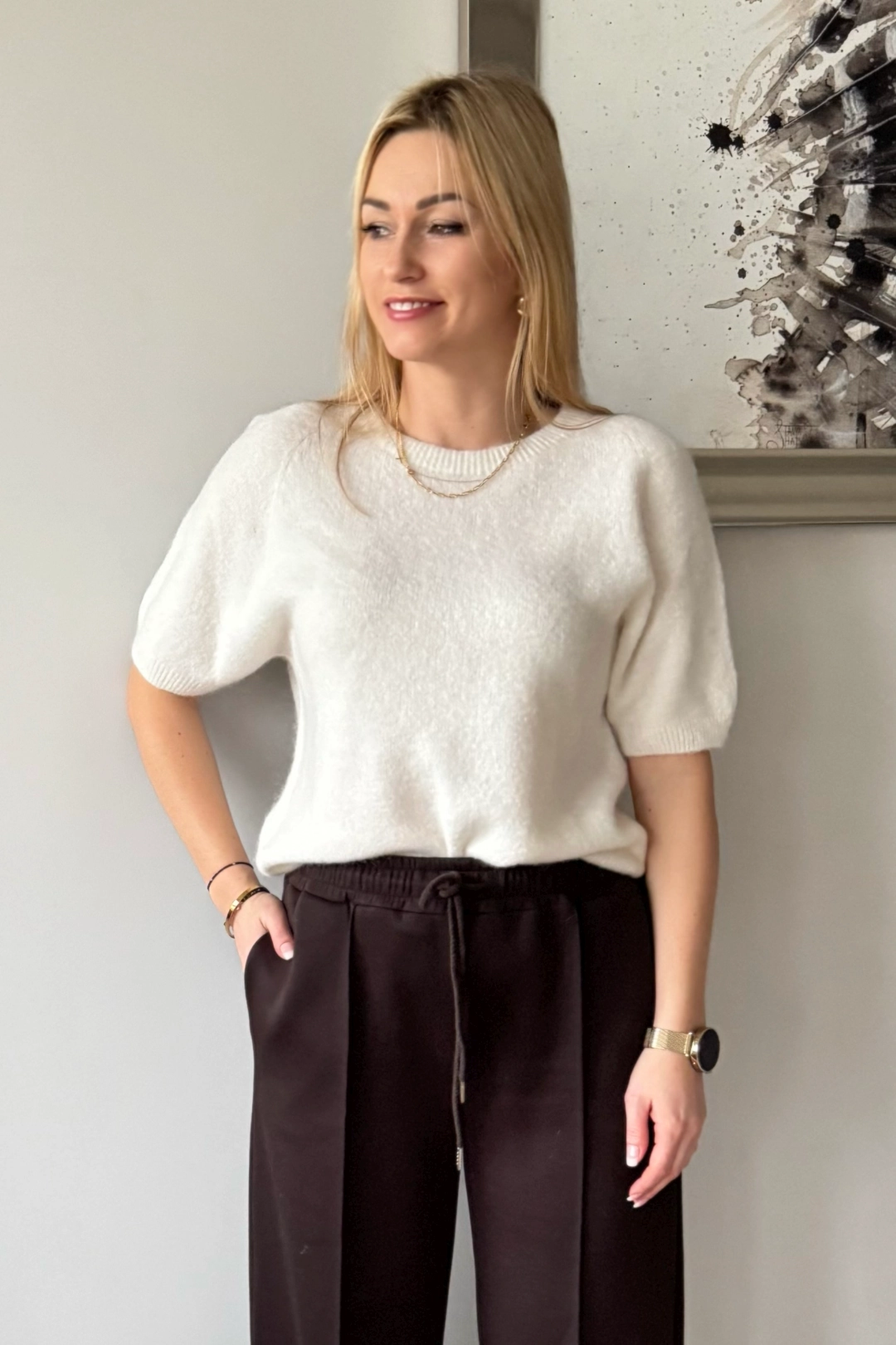 Subtelny design – krótki rękaw dodaje lekkości, w dodatku sprawia, że sweter można nosić o każdej porze roku.