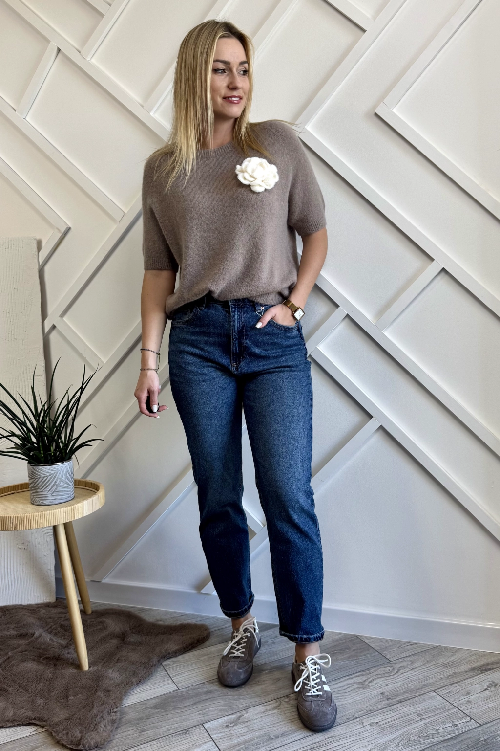 Sweter z alpaki na krótki rękaw mocca